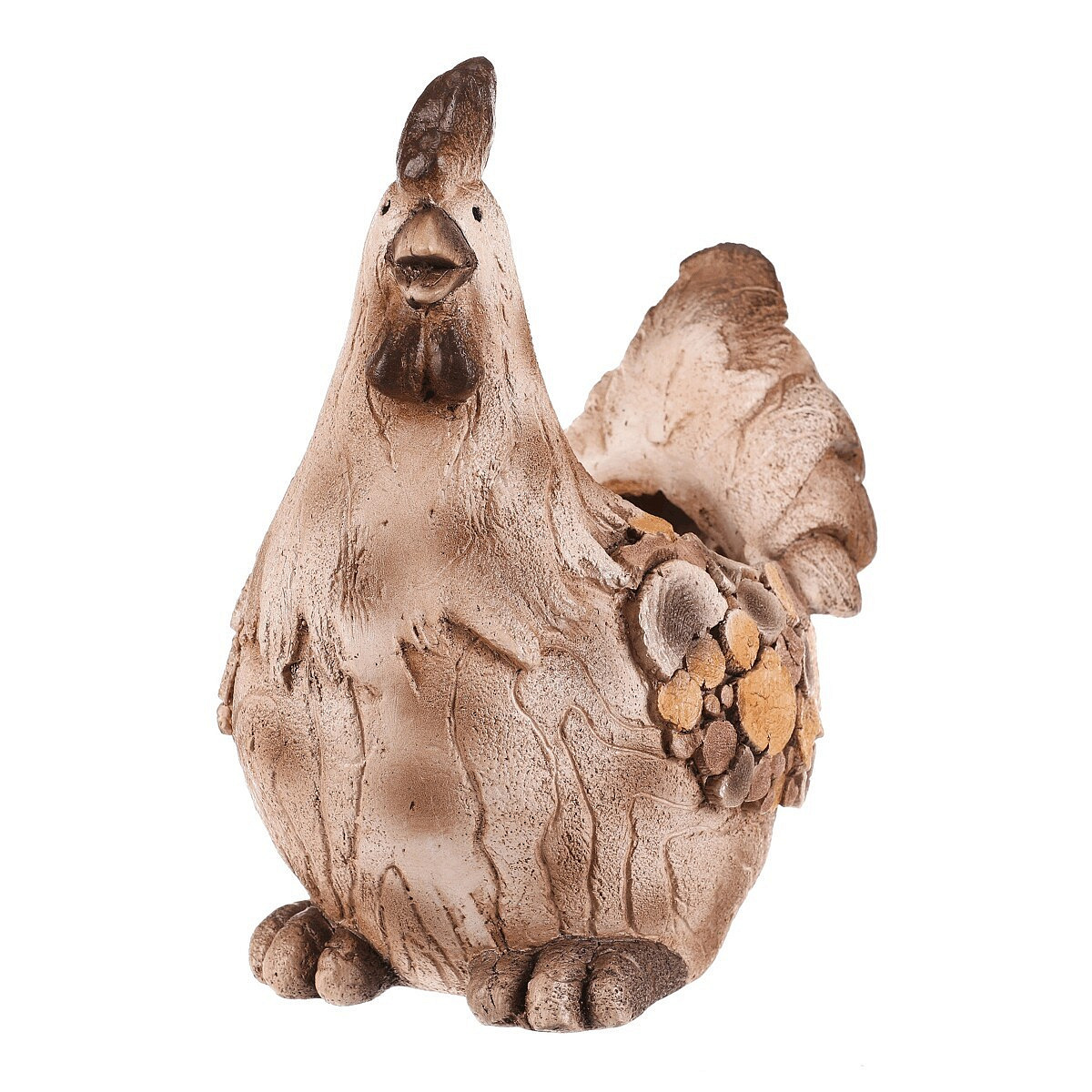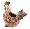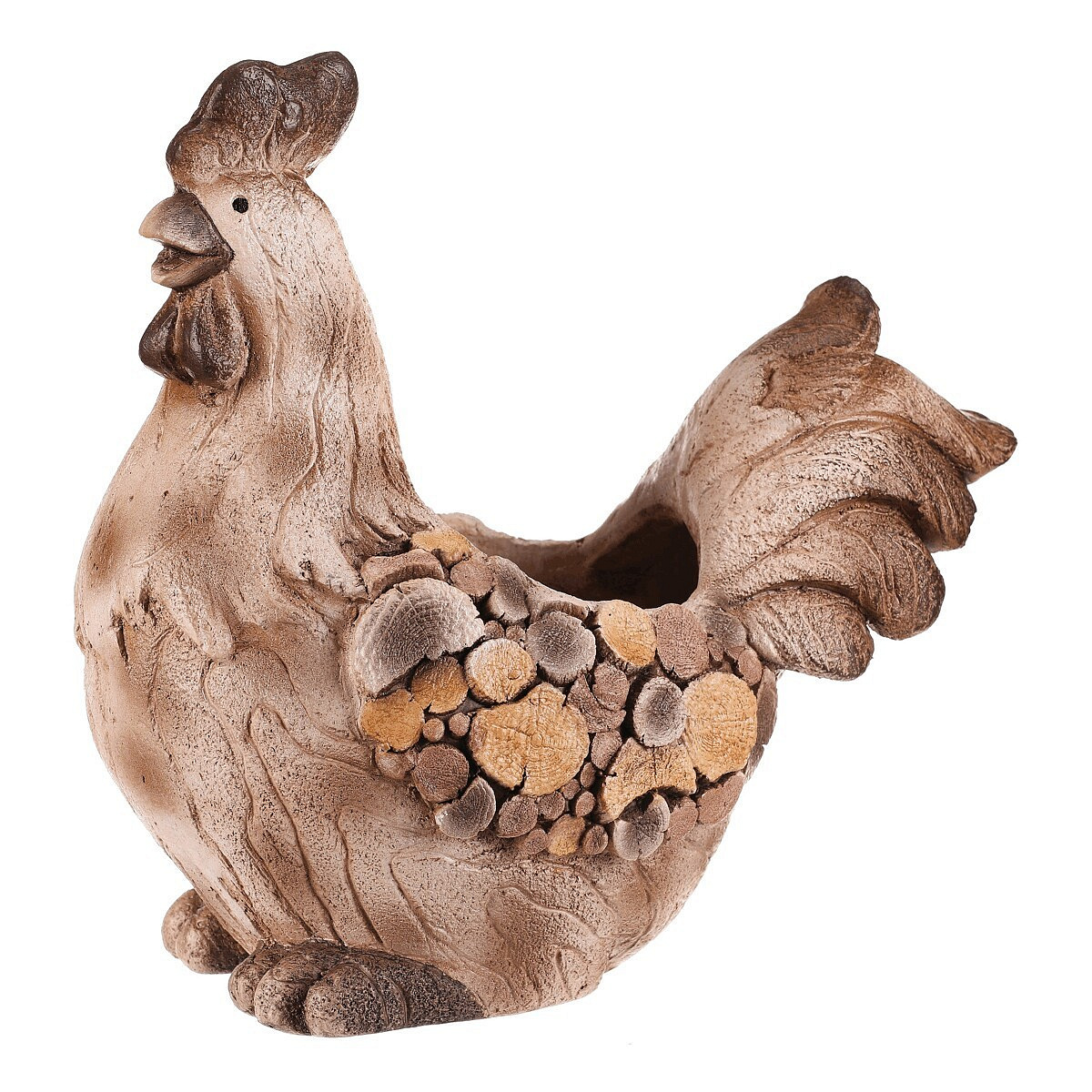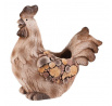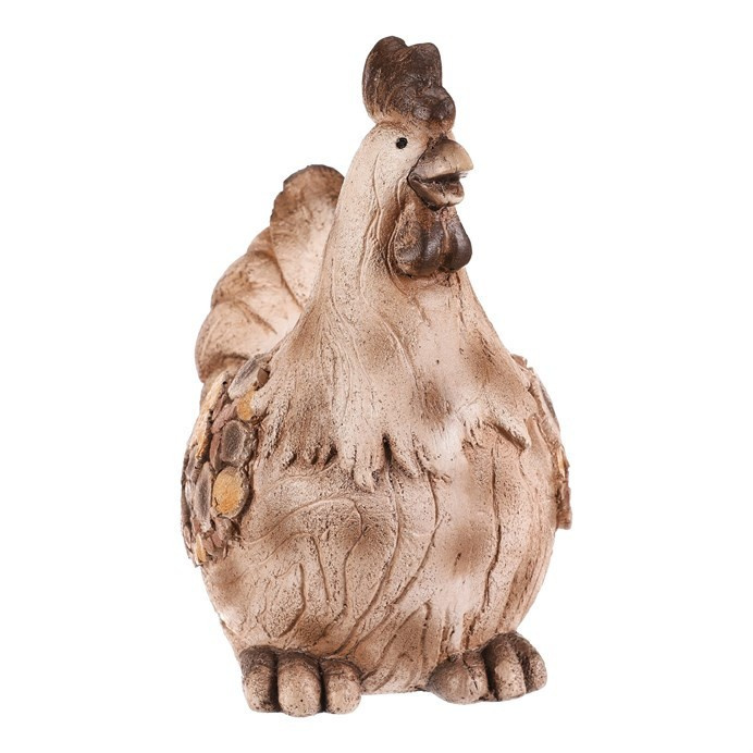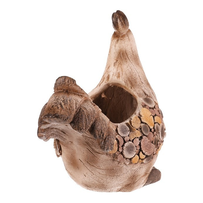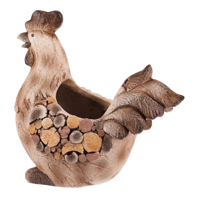 Dekorativní obal na květiny ve tvaru slepičky je vyroben z magnesia s povrchovou úpravou připomínající dřevo. Jeho hnědé tóny a detailní textury dodávají přírodní vzhled, který vynikne v zahradě i na terase. Kompaktní tvar a stabilní základna umožňují bezpečné umístění květináče. Obal je vhodný pro různé druhy rostlin a přispívá k vytvoření útulné atmosféry v exteriéru i interiéru.