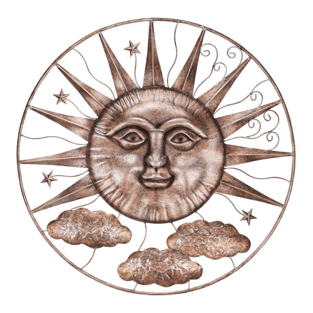 Tato nástěnná dekorace přináší harmonii slunce a obláčků v měděných a bílých odstínech, zasazených do kruhu. Elegantní kovové provedení oživí váš interiér či venkovní prostor jemnými tóny, které navozují pocit klidu a světla.