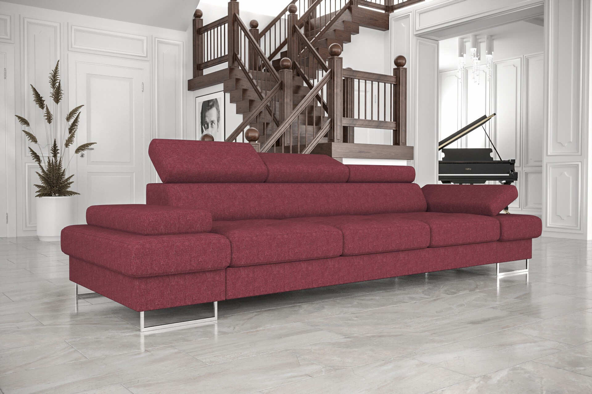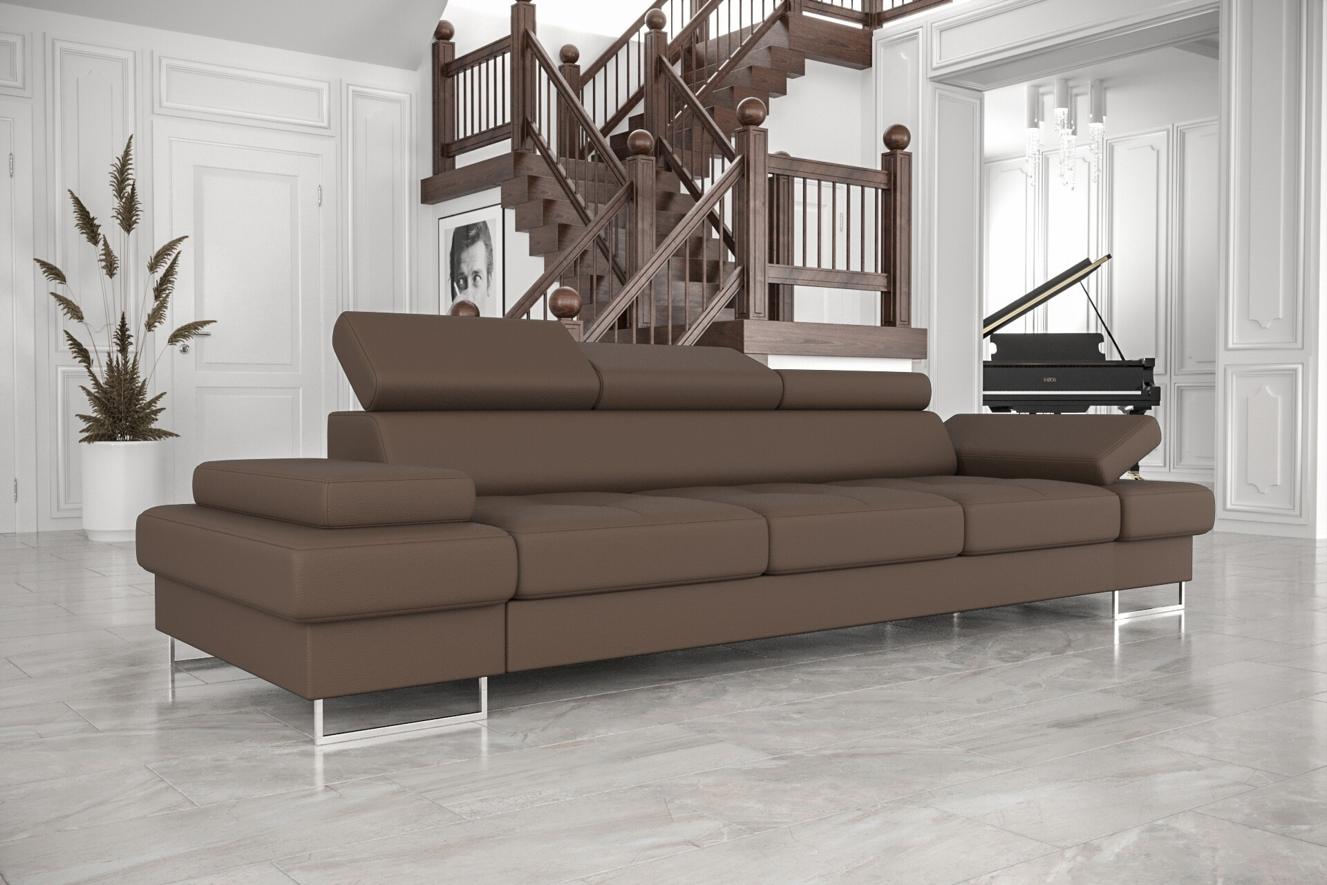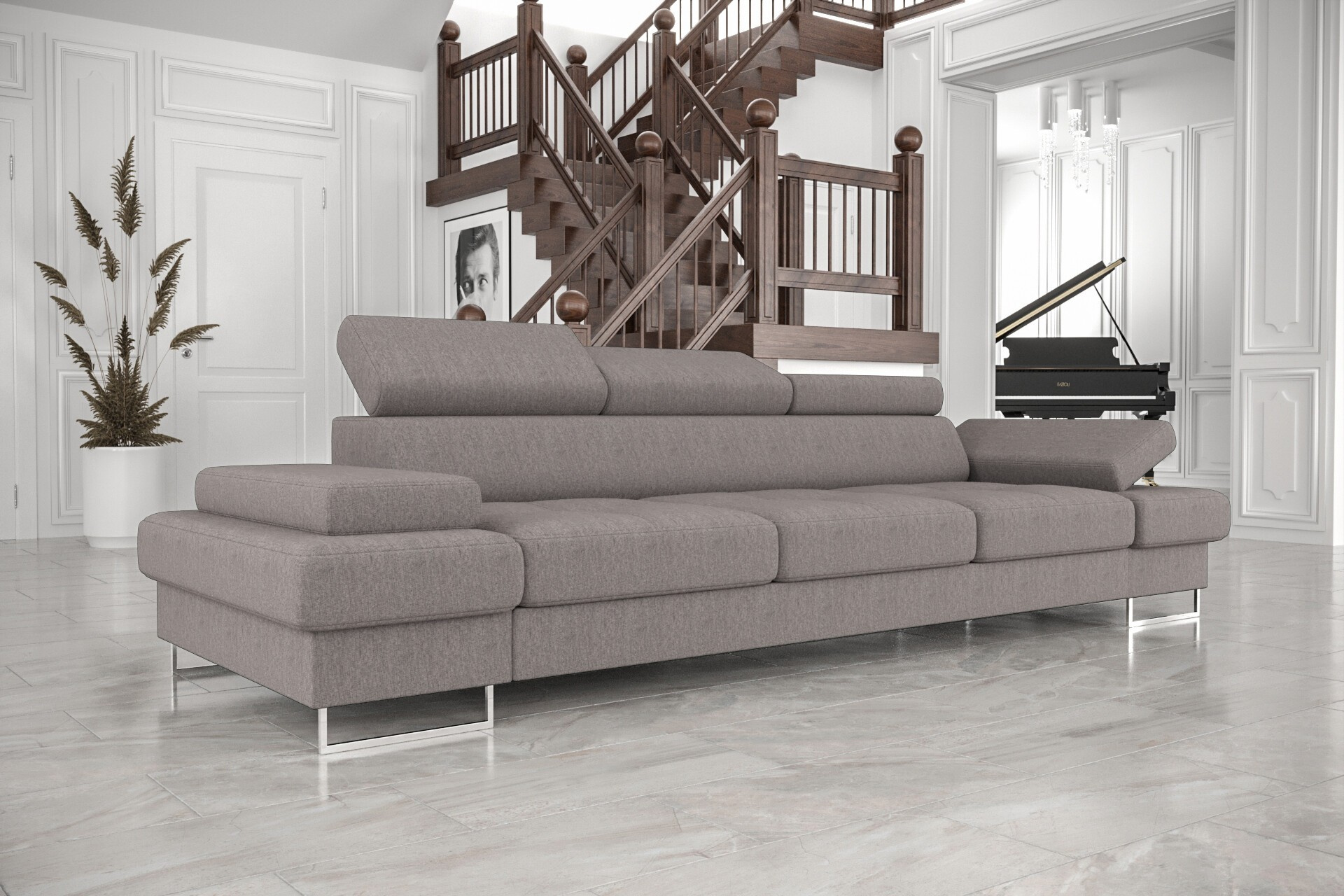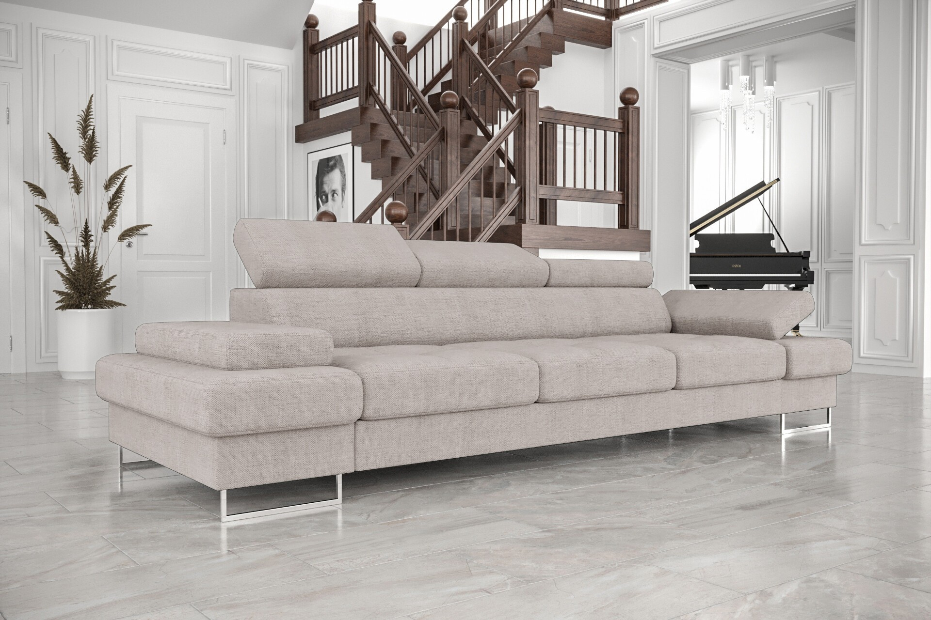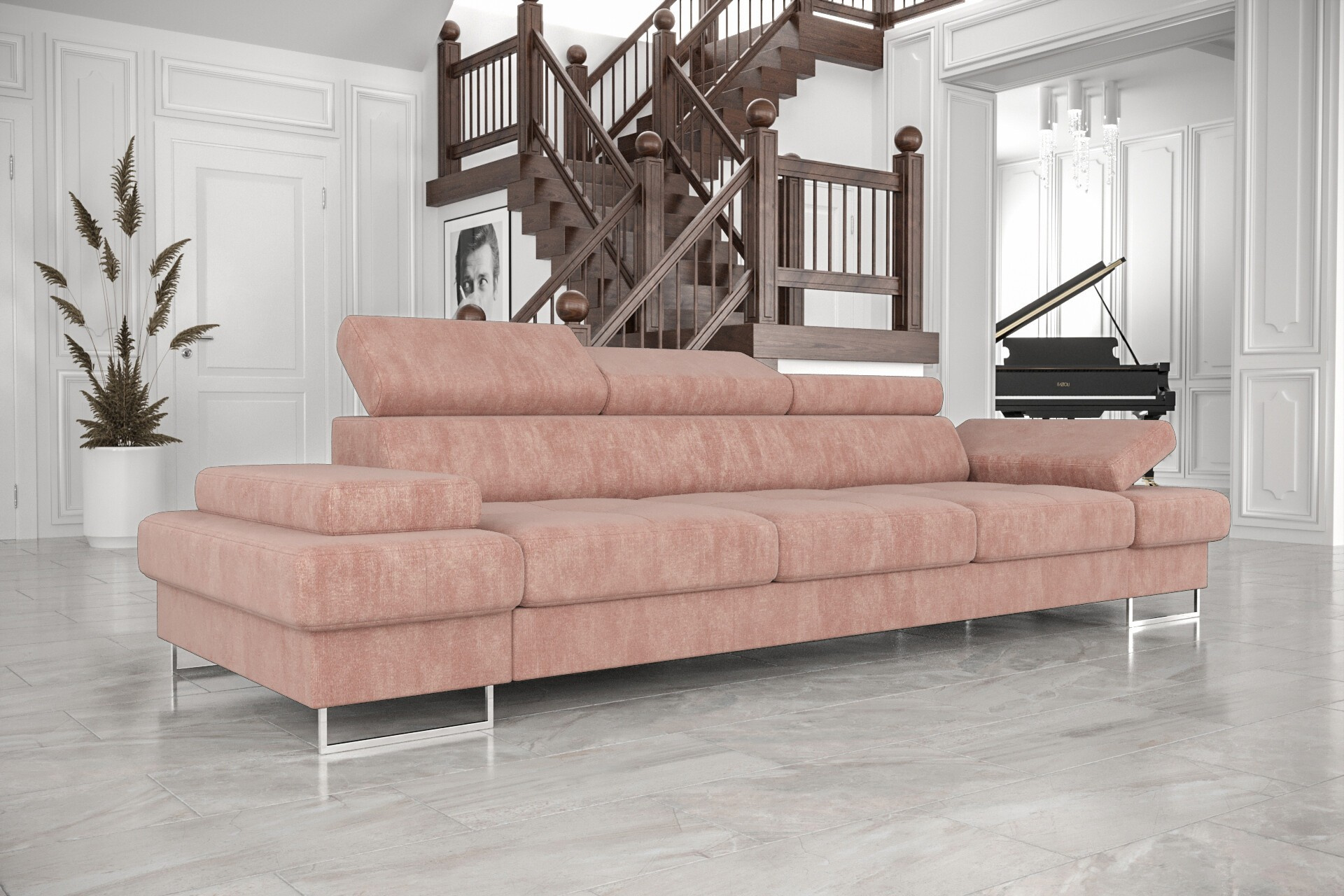 - Prostornost a pohodlí: S šířkou 305 cm nabízí pohovka dostatek místa pro celou rodinu i návštěvy. Hluboký sedák (56 cm) a ergonomicky tvarované opěrky zajišťují maximální pohodlí při sezení i ležení.