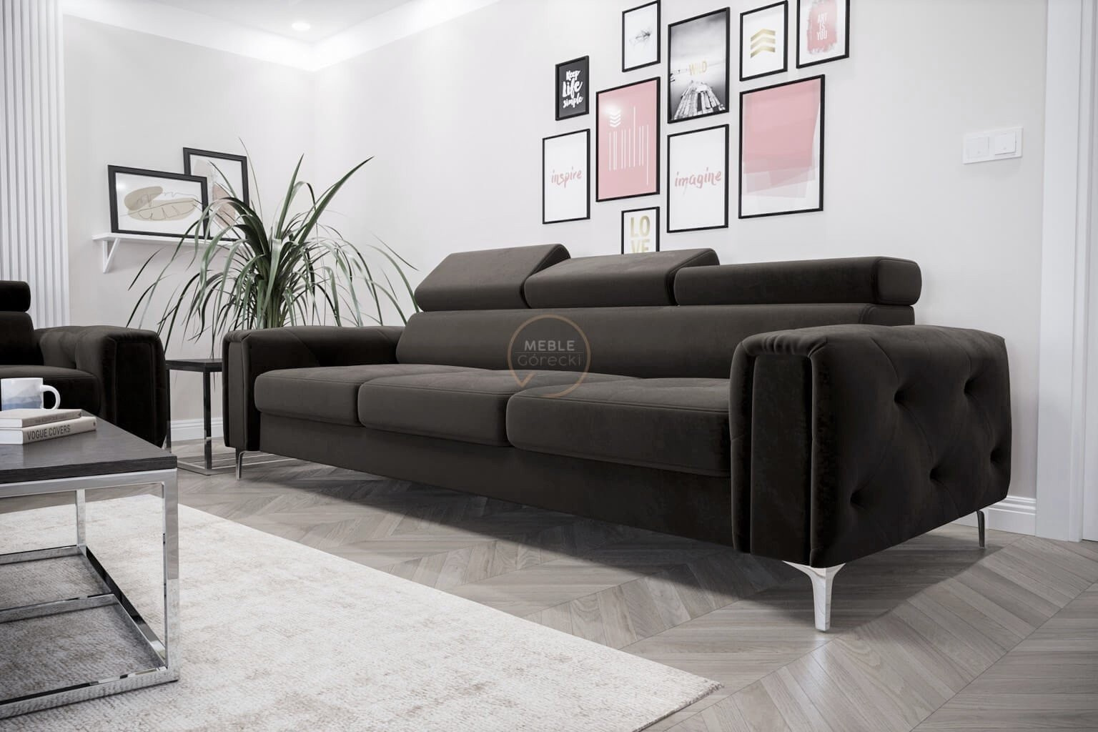 Kolekce čalouněného nábytku Orion je něco, co nikde jinde nenajdete! Charakteristickým prvkem jsou krásně zdobené, prošívané boky ve stylu glamour. Kromě estetických prvků stojí za to věnovat pozornost dokončení v podobě nastavitelných opěrek hlavy, které usnadní přizpůsobení výšky opěradla tak, aby byla pro vás ideální. Vysoké 13 cm kovové nohy podtrhují celek a dodávají konstrukci lehkost.