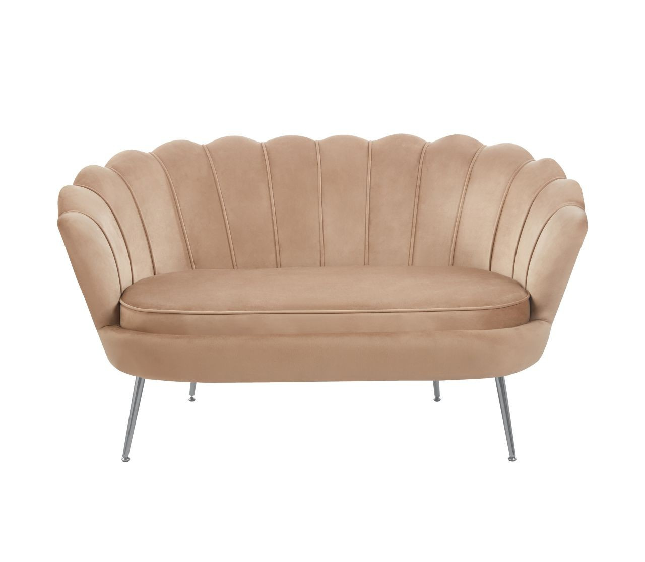 Rozměry: - šířka sedáku: 106 cm - celková šířka: 138 cm - výška sedáku: 44 cm - celková výška: 79 cm - hloubka sedáku: 53 cm - celková hloubka: 74 cm Materiál - čalounění: samet - rám: chromovaný kov Barva: - sedák: cappuccino - rám: stříbrný