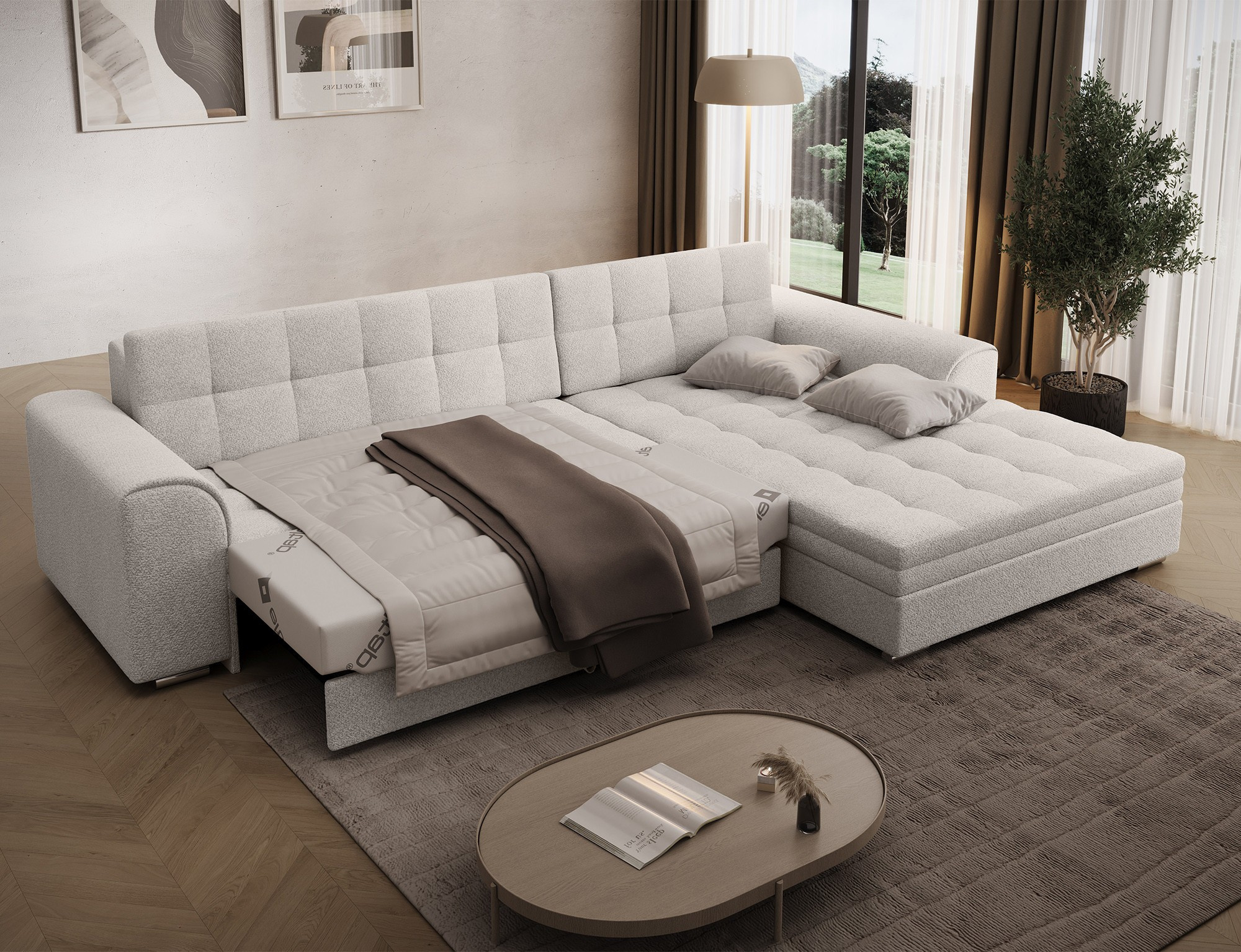 Rohová sedací souprava SORENTO je vyrobena z kvalitních materiálů. Konstrukce sedací soupravy je vyrobena z kombinace dřeva a dřevotřísky. Sedací část je vyrobena v kombinaci polyuretanové pěny T3040 + T2542 a vlnitých pružin. Na opěru sedací soupravy je použita polyuretanová pěna T2542. Sedací souprava je rozkládací pomocí rozkladu typu Delfín.