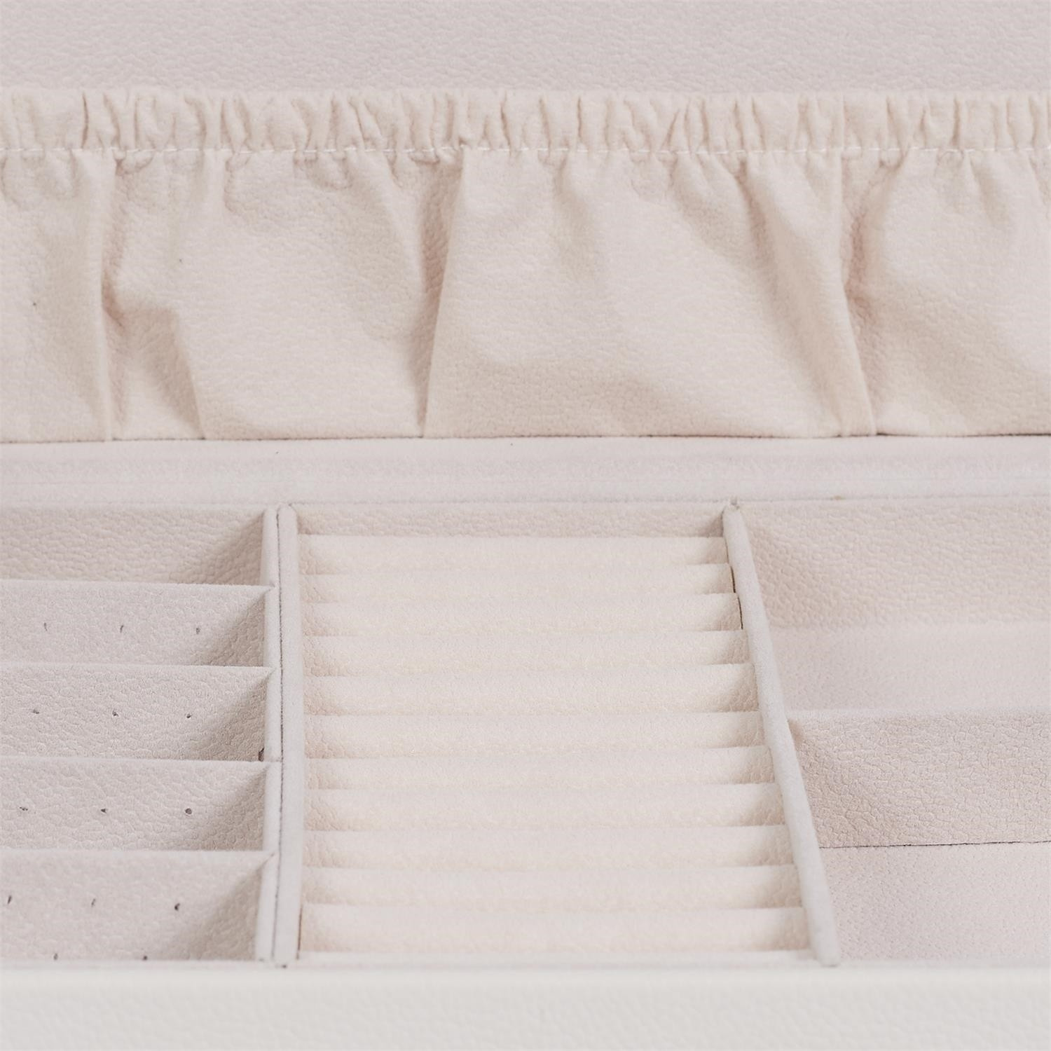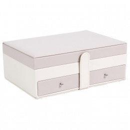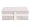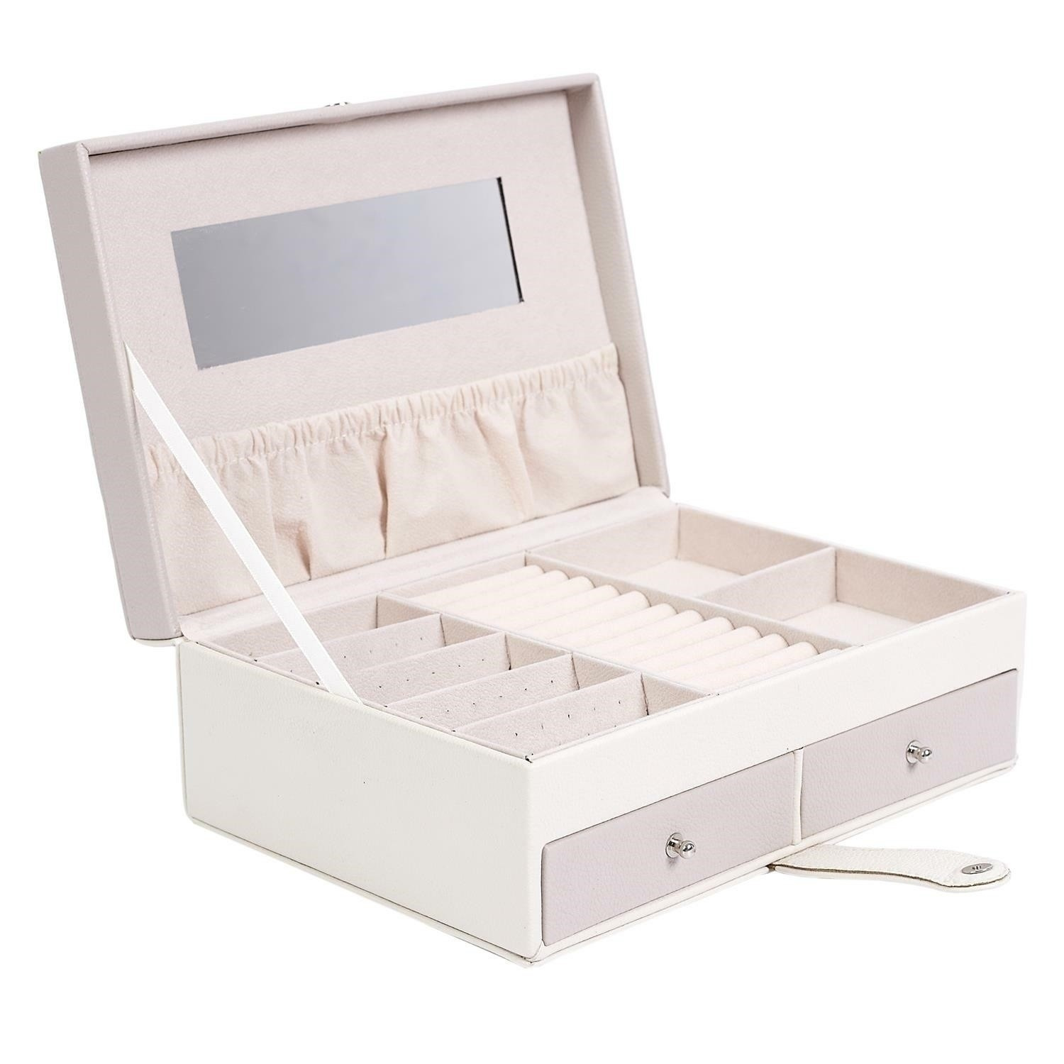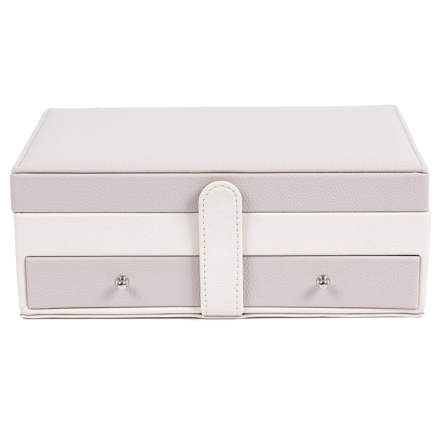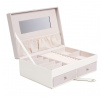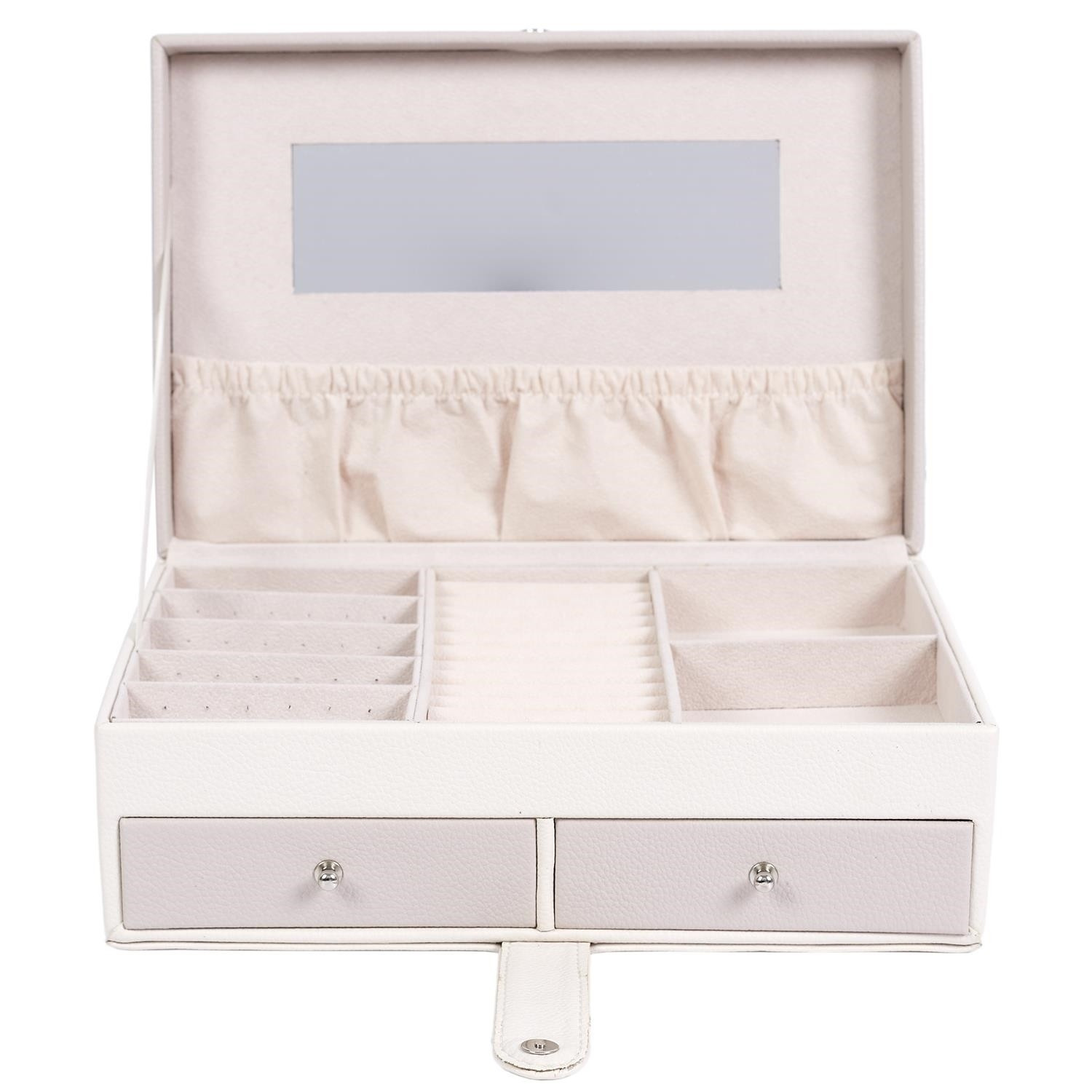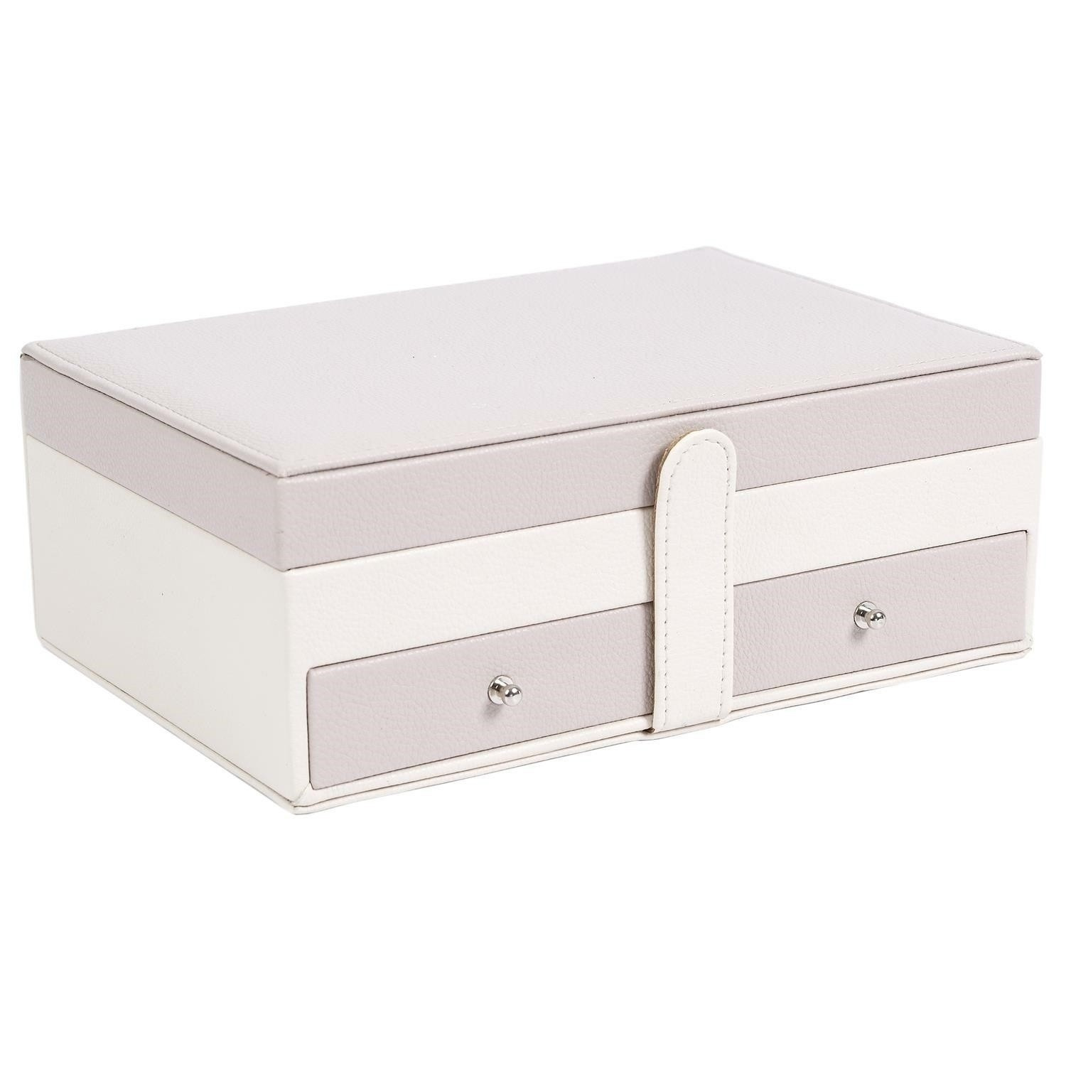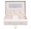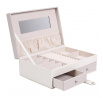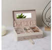 Šperkovnice Lady je vše, co potřebujete k udržení pořádku a organizace mezi svými šperky. Má mnoho přihrádek na prsteny, náušnice nebo náramky. Uvnitř je vyložena příjemnou na dotek tkaninou. Jeho přednosti zahrnují také dvě prostorné zásuvky, vnitřní zrcátko a také dodatečnou kapsičku na víku. Šperkovnice pokrytá ekologickou kůží je uzavíratelná na pohodlný západkový uzávěr. Počet kartonů: 1 Rozměry kartonů: 25x9,5x17cm