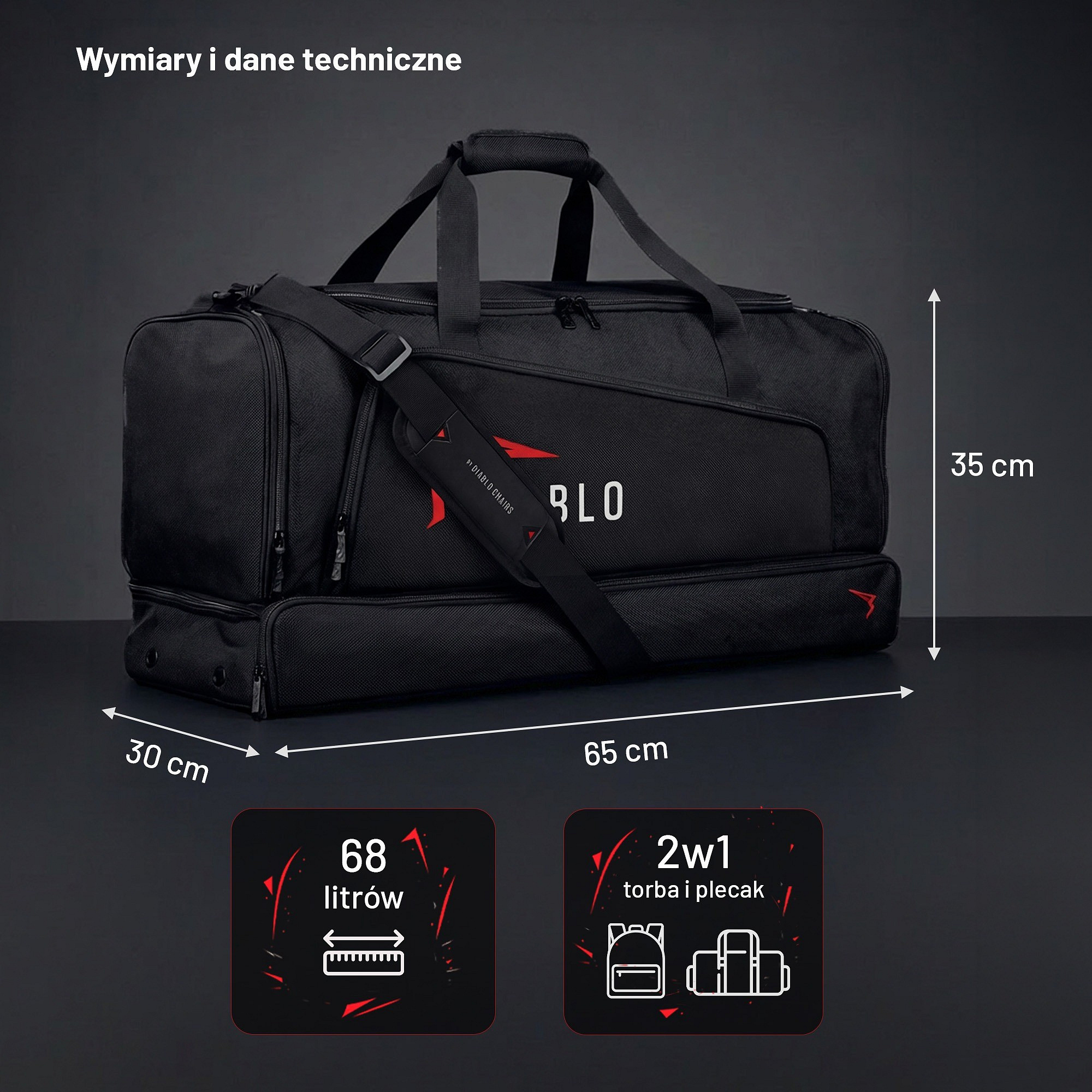 S kapacitou 68 litrů se do tašky Diablo Chairs vejde opravdu všechno. Oblečení, boty, ručník, doplňky, proteinový nápoj – nic vás nebude omezovat. Už nemusíte nosit několik tašek najednou, všechno se vejde do jedné.