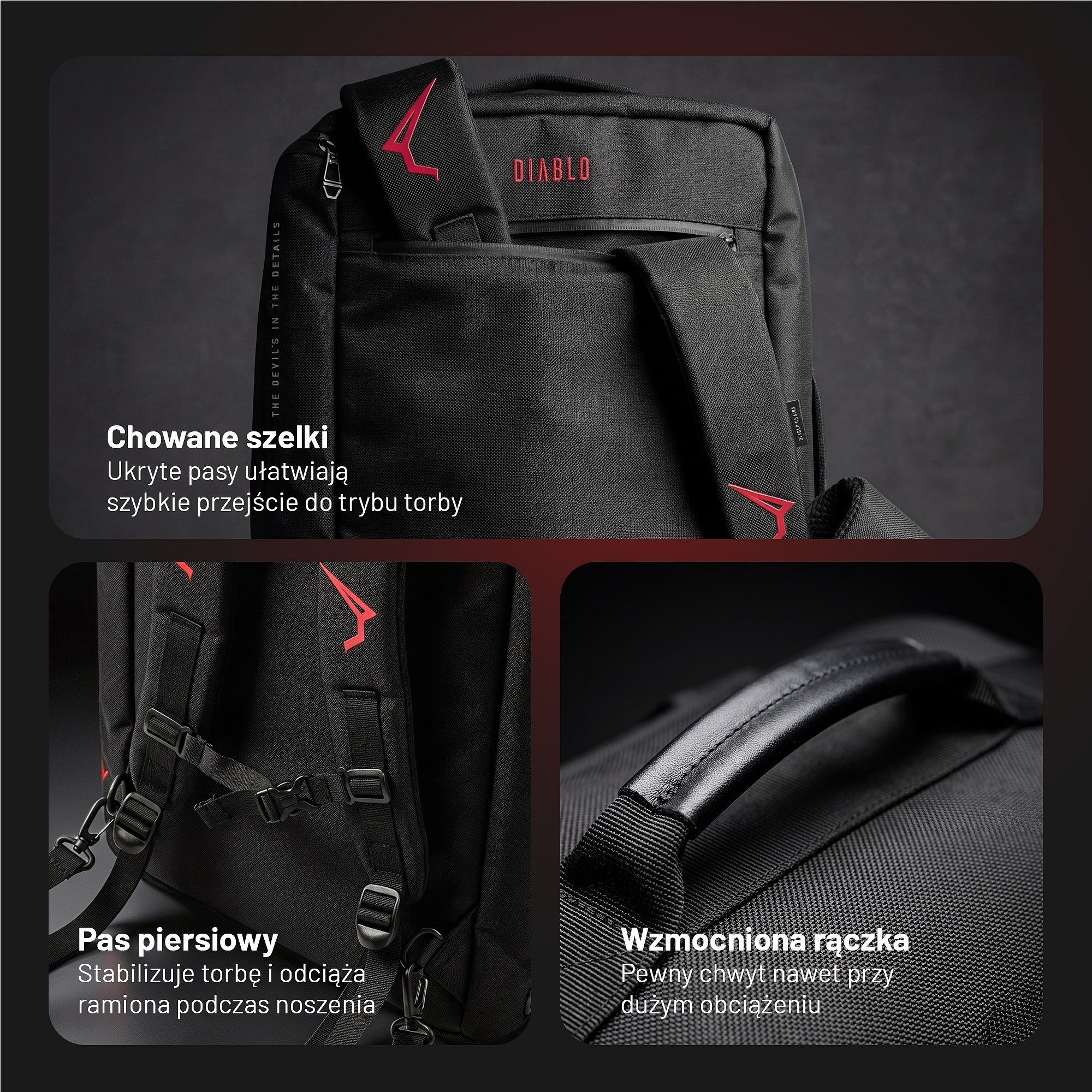 Taška Diablo Chairs se přizpůsobí vašemu životnímu stylu. Můžete ji nosit klasicky na rameni, jako batoh pro větší volnost pohybu, nebo v ruce pomocí zesíleného držadla. Popruhy lze snadno schovat do speciální kapsy, takže nepřekážejí a nenarušují elegantní vzhled tašky.