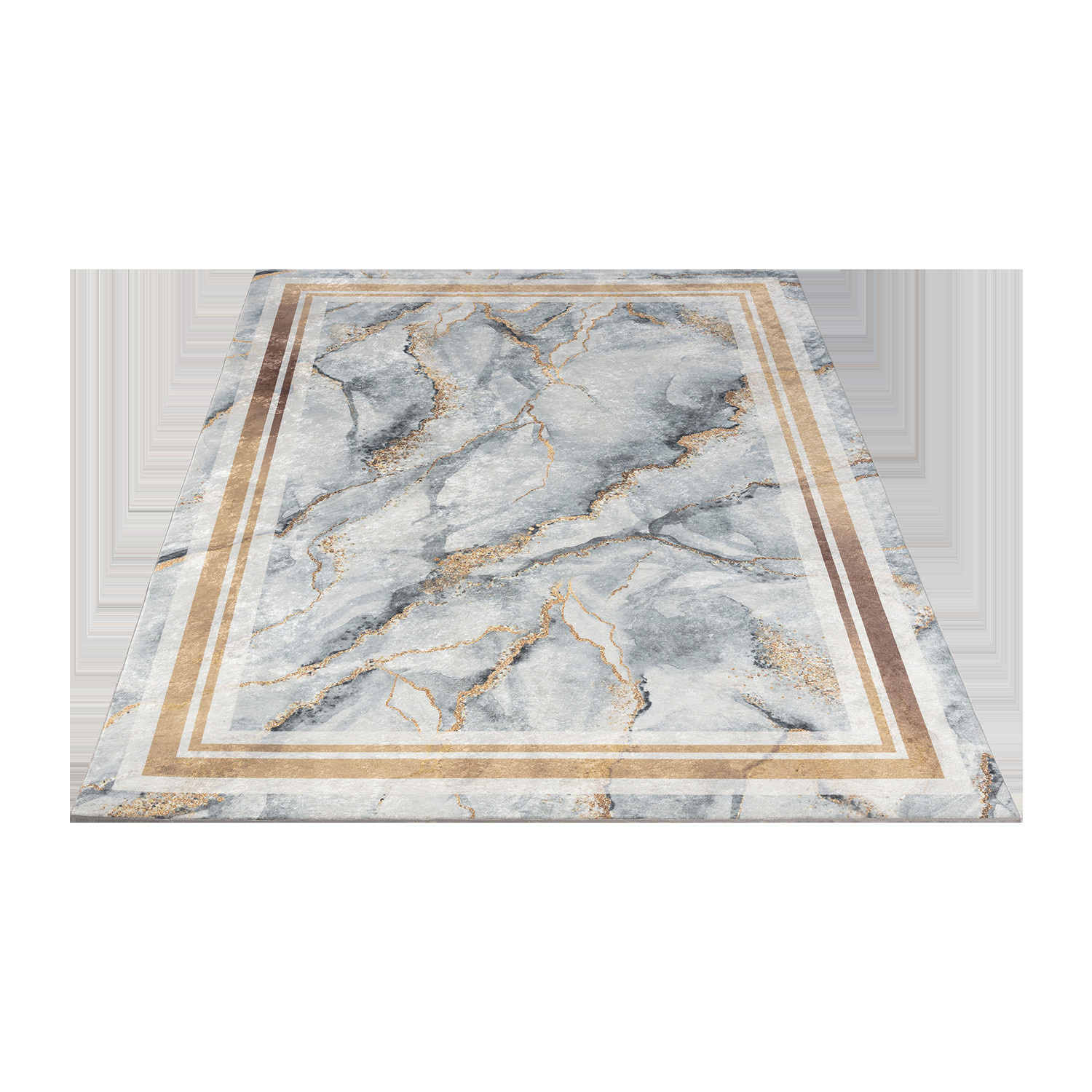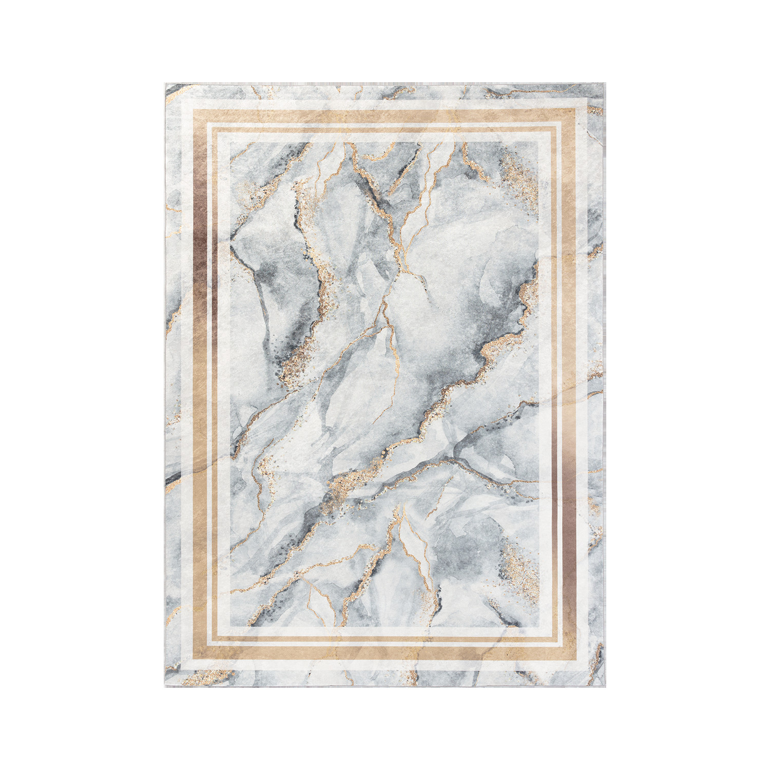 Koberec Squitta Grey Gold je luxusní návrh. Povrch potištěný vzorem stylizovaným jako vzácný mramor je kombinován se zlatým rámem. To činí tento produkt senzační volbou pro interiéry vyzdobené s vkusem, kde se vkusný půvab setkává s elegancí. Polyesterový vlas a jutová spodní strana koberce zajišťují, že model neztratí svou krásu příliš rychle, chrání jej před poškozením, třepením a nečistotami.