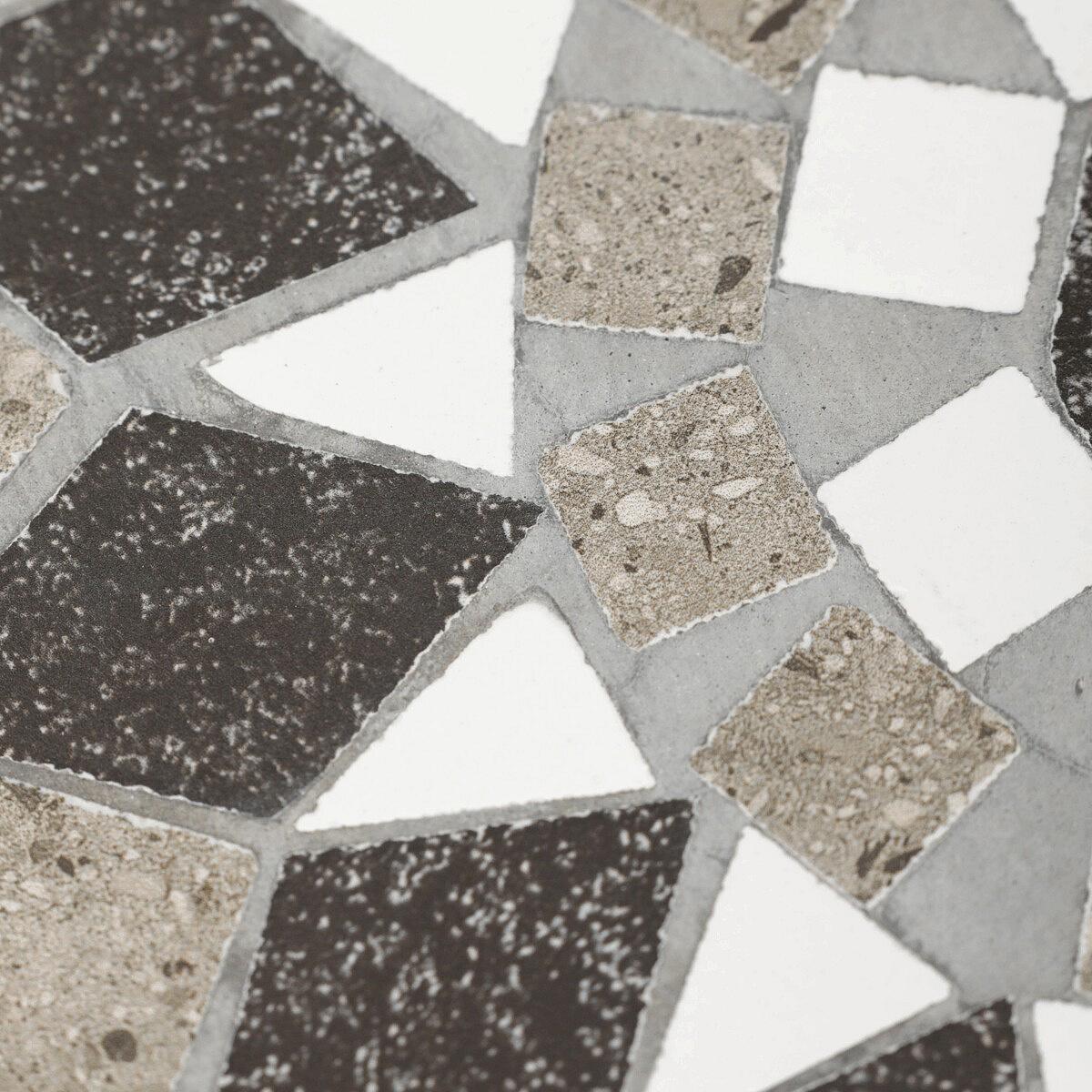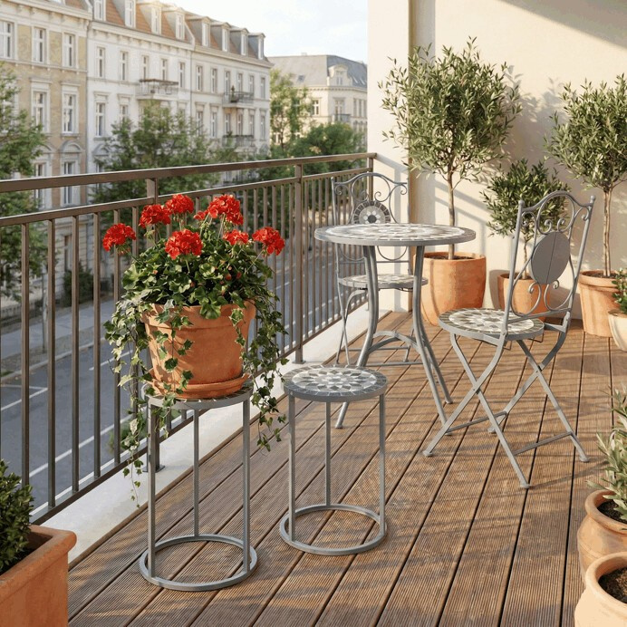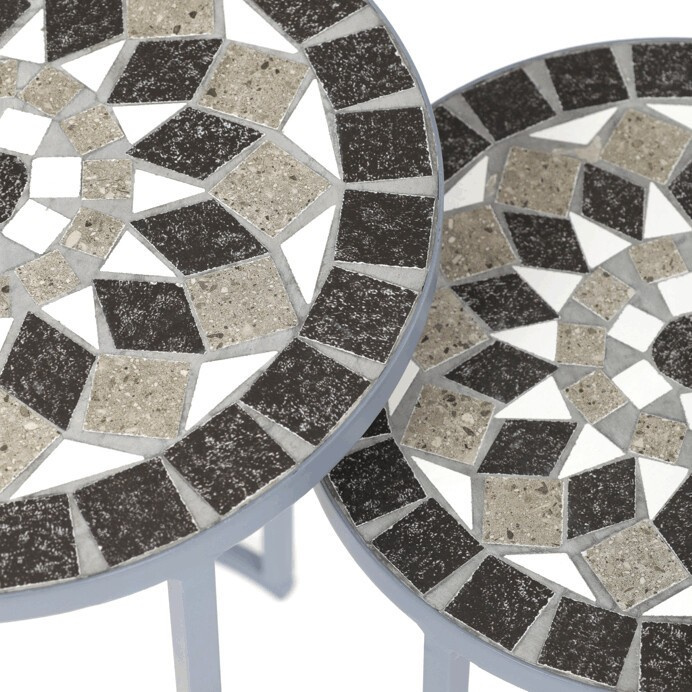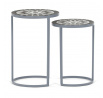 Sada dvou stojanů na květiny v šedém provedení kombinuje pevnou kovovou konstrukci s dekorativní keramickou deskou s mozaikovým vzorem. Kulaté desky zdobí geometrický motiv v přírodních odstínech šedé a bílé, který dodává stojanům výrazný vizuální efekt. Kovová podnož je navržena tak, aby zajistila stabilitu a zároveň působila vzdušně díky otevřenému tvaru s obloukovým spodním rámem. Stojany jsou vhodné pro umístění květin nebo dekorativních předmětů v interiéru i na kryté venkovní prostory. Díky různým velikostem lze stojany kombinovat a vytvořit tak zajímavou kompozici.
