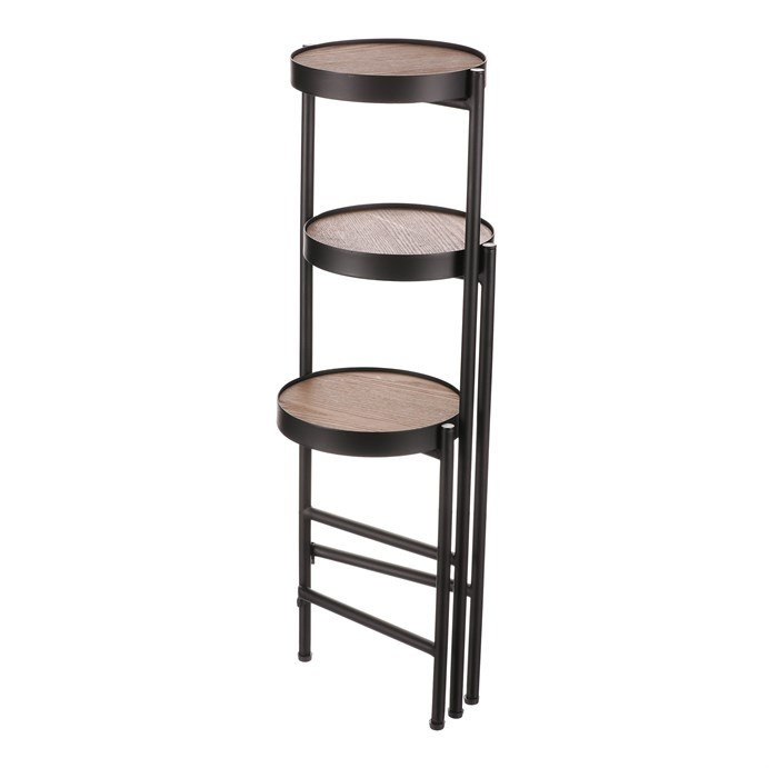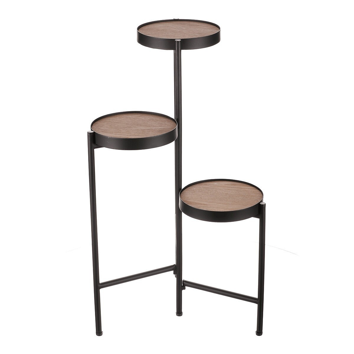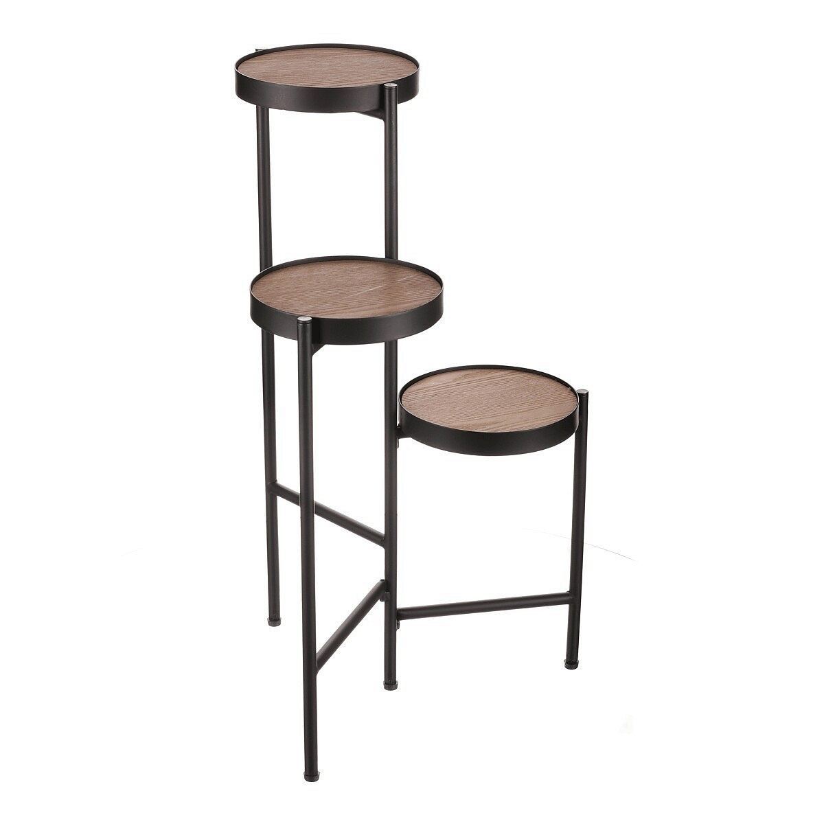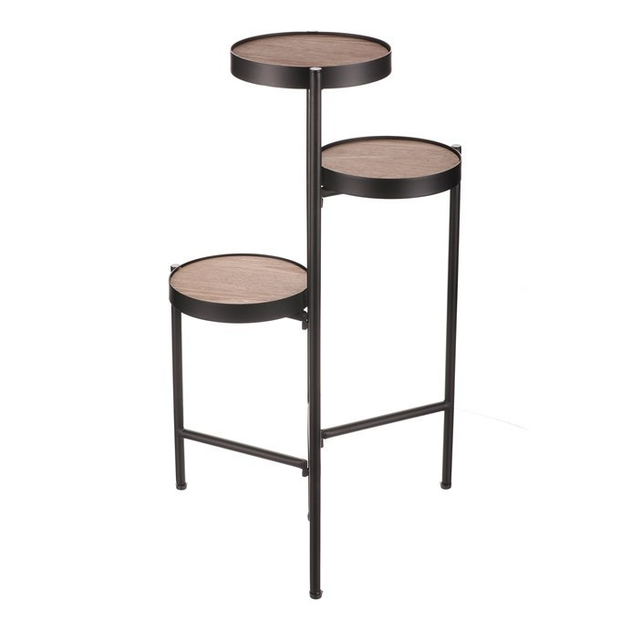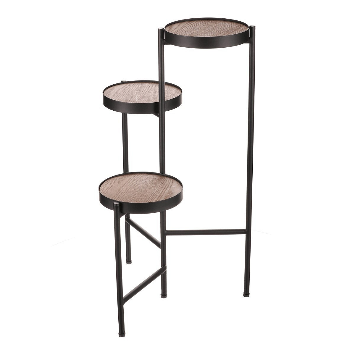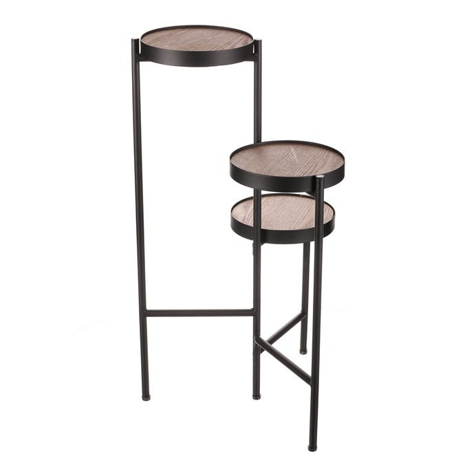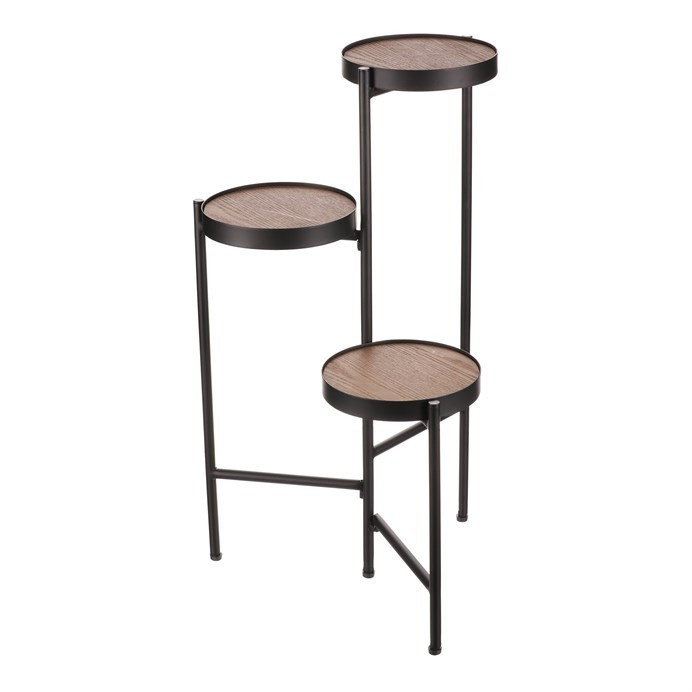Bytový doplněk v podobě kovového stojanu v černé barvě bude skvělým pomocníkem pro prostorové umístění květin. Skládá se ze tří nosných ploch s podlážkami z MDF desek, potažené jasanovou dýhou, které jsou v různých výškách. Svým provedením je uzpůsoben pro umístění v rohu místnosti. Můžete tak krásně využít této mnohdy problematické plochy a terasovitě nechat vyniknout krásu rostlin na něm umístěných.