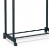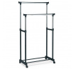 Dvojramenný stojan na šaty v černém provedení kombinuje pevný kovový rám s plastovými prvky pro stabilitu a snadnou manipulaci. Výškově nastavitelná horní tyč umožňuje přizpůsobení podle potřeby, což zajišťuje optimální využití prostoru a pohodlné zavěšení oděvů různých délek. Spodní odkladač nabízí praktické místo pro uložení bot nebo dalších doplňků. Stojan je vybaven kolečky, která usnadňují přesun v interiéru bez poškození podlahy. Kompaktní design a kvalitní materiály zaručují dlouhodobé užívání v domácnostech i komerčních prostorách.