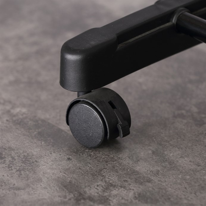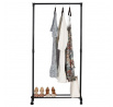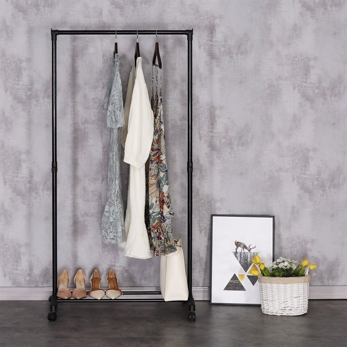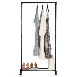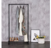 Stojan na šaty je vyroben kombinací lehkého kovu v povrchové úpravě v černém laku a plastu. Věšák má pro snazší manipulaci kolečka z čehož mají dvě možnost aretace.