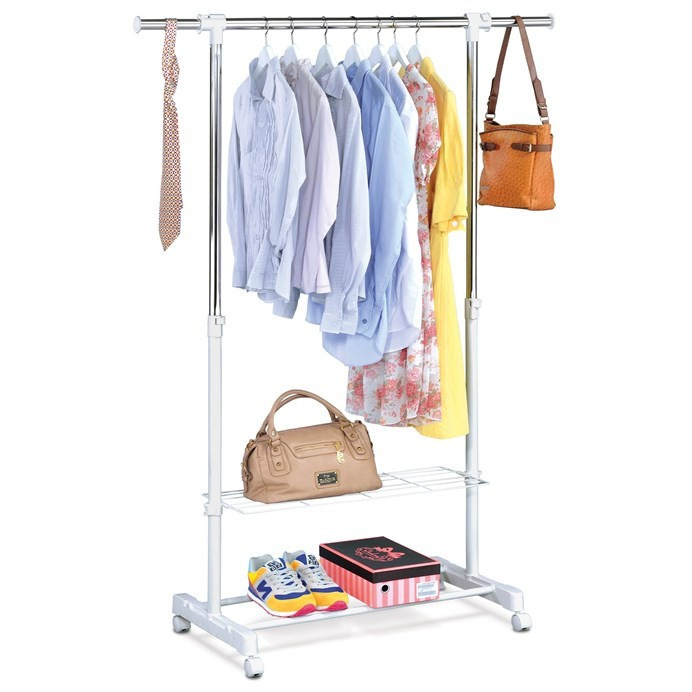Stojan na šaty s odkladačem a poličkou v bílé barvě kombinuje pevný kovový rám s chromovanými prvky, které dodávají moderní vzhled a odolnost proti opotřebení. Výška stojanu je nastavitelná, což umožňuje přizpůsobit prostor pro zavěšení oděvů různých délek. Praktická spodní polička a odkladač poskytují dostatek místa pro uložení bot, krabic nebo tašek, čímž pomáhají udržet pořádek. Stabilní podstavec je vybaven kolečky pro snadnou manipulaci a přesun v interiéru. Díky kombinaci kovu a plastu je stojan navržen pro dlouhou životnost a snadnou údržbu.