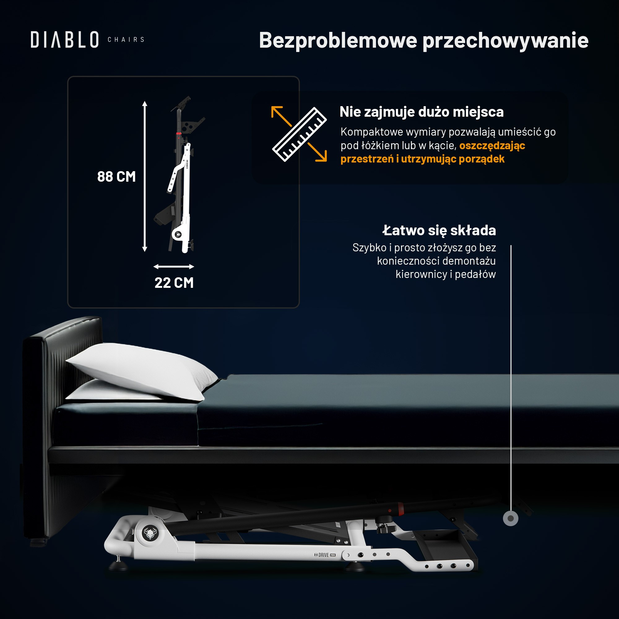 Po skončení závodu můžete stojan X-Drive Mini snadno a rychle složit. Díky mechanismu rychlého skládání ušetříte cenné místo ve svém pokoji a udržíte v něm pořádek. A co je nejlepší, nemusíte demontovat volant ani pedály! Jednoduše složíte stojan a uložíte ho, dokud nebudete připraveni na další závod.