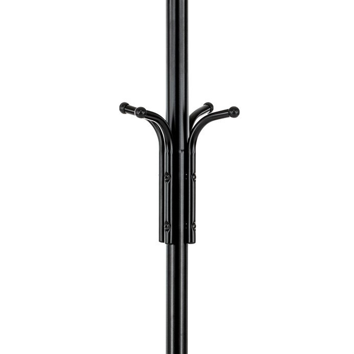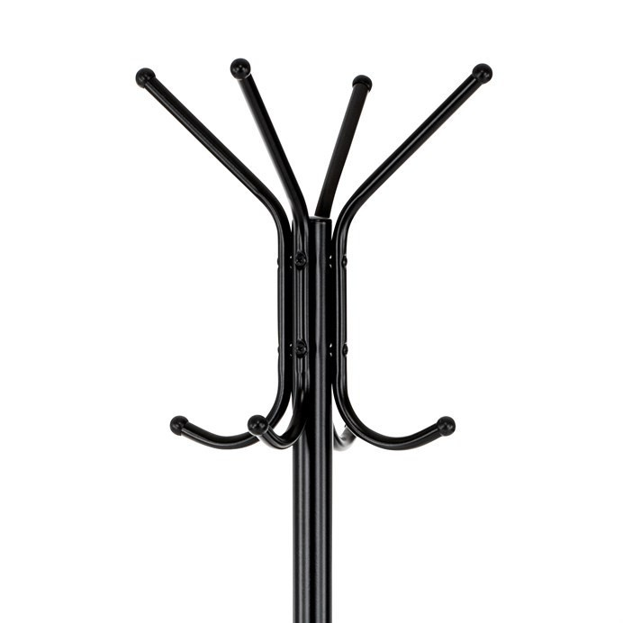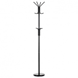 Stojanový věšák s výškou 182 cm je vyroben z pevného kovu s matnou černou povrchovou úpravou, která zajišťuje odolnost proti poškození a snadnou údržbu. Věšák nabízí celkem deset háčků rozmístěných ve dvou úrovních, což umožňuje efektivní zavěšení kabátů, klobouků či tašek. Stabilní kulatá základna přispívá k bezpečnému postavení a nosnost 10 kg odpovídá běžným nárokům na zavěšení více kusů oblečení. Díky jednoduchému a funkčnímu designu se hodí do kanceláří, vstupních hal i domácností.