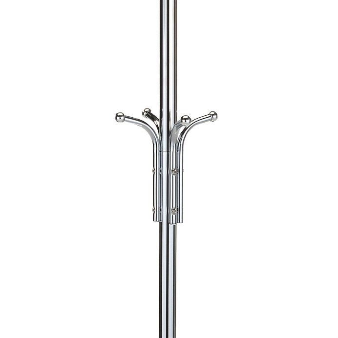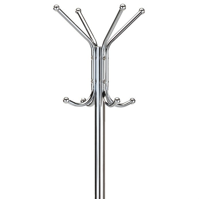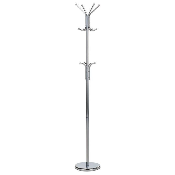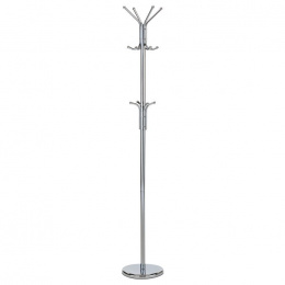 Stojanový věšák s výškou 182 cm je vyroben z pevného kovu s lesklou chromovou povrchovou úpravou, která zajišťuje odolnost a snadnou údržbu. Věšák nabízí celkem dvanáct háčků rozmístěných ve třech úrovních, což umožňuje efektivní uspořádání kabátů, klobouků i doplňků. Stabilní kruhová základna zajišťuje pevnost a bezpečnost při používání, přičemž maximální nosnost činí 10 kg. Díky minimalistickému designu v moderním stříbrném provedení se hodí do různých interiérů, od kanceláří po domácnosti.