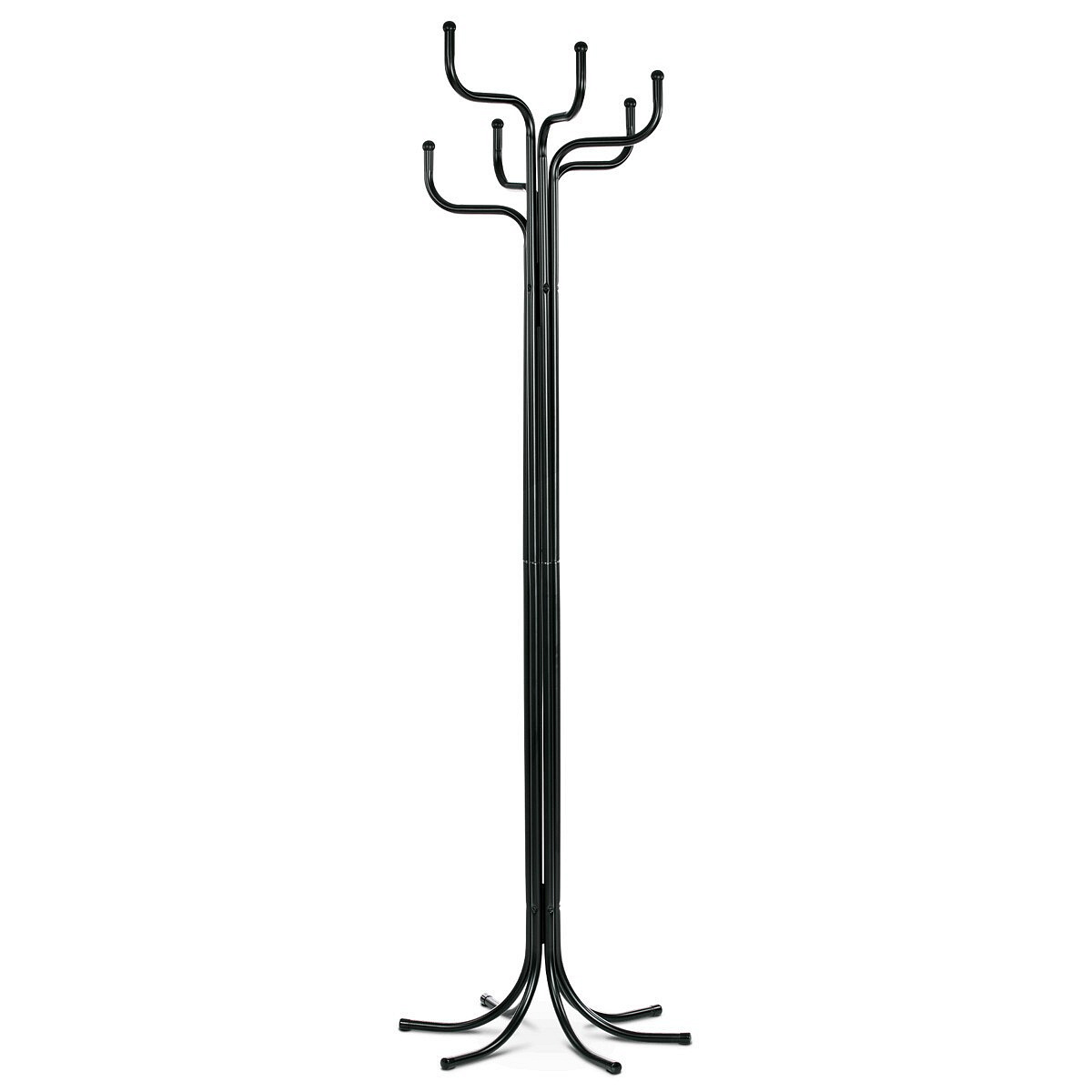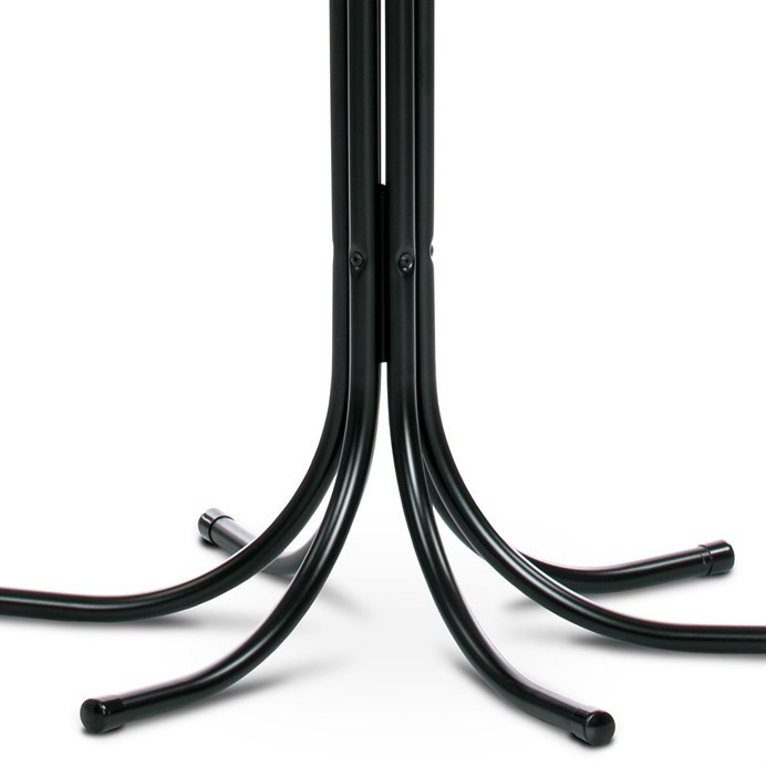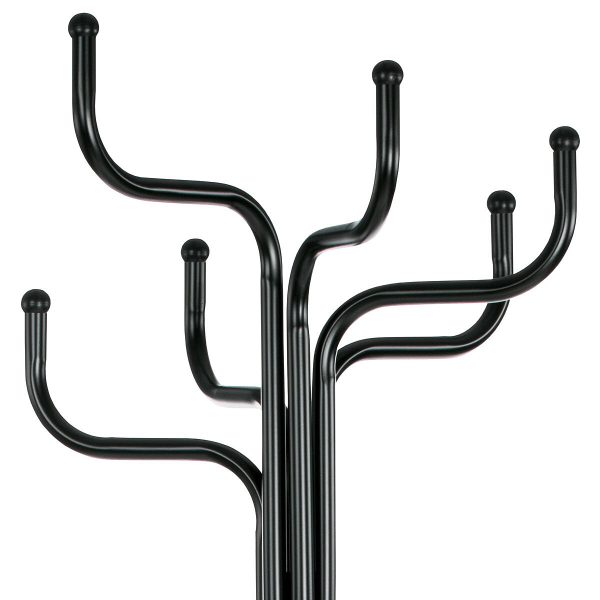 Stojanový věšák v černém matném provedení nabízí šest pevných kovových ramen zakončených kulatými koncovkami, které zajišťují bezpečné zavěšení oděvů a doplňků. Výška 188 cm umožňuje pohodlné využití v předsíních, kancelářích či čekárnách. Stabilní kovová základna s rozloženými nohami zajišťuje pevnost a rovnováhu i při plném zatížení do 12 kg. Povrchová úprava matným lakem chrání materiál proti poškození a usnadňuje údržbu. Věšák kombinuje jednoduchý design s funkčností, vhodný pro různé typy interiérů.