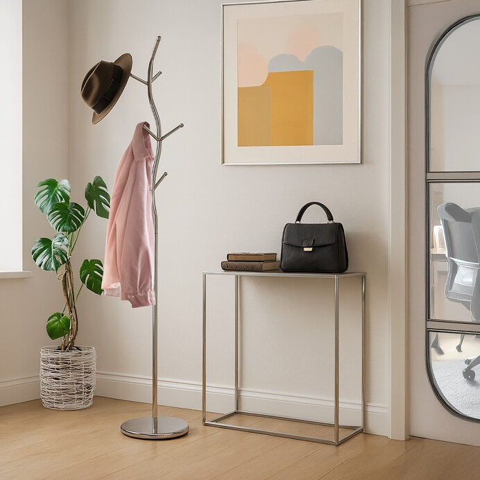 Stojanový věšák s výškou 180 cm je vyroben z pevného chromovaného kovu, který zajišťuje stabilitu a dlouhou životnost. Design věšáku tvoří elegantní zakřivené tyče s osmi kovovými háčky zakončenými kulatými koncovkami, které chrání oděvy před poškozením. Pevná kruhová základna přispívá k vyváženosti a bezpečnému postavení i při plném zatížení do 10 kg. Věšák je vhodný pro domácnosti i kanceláře, kde nabízí praktické a stylové řešení pro zavěšení kabátů, bund či doplňků.
