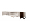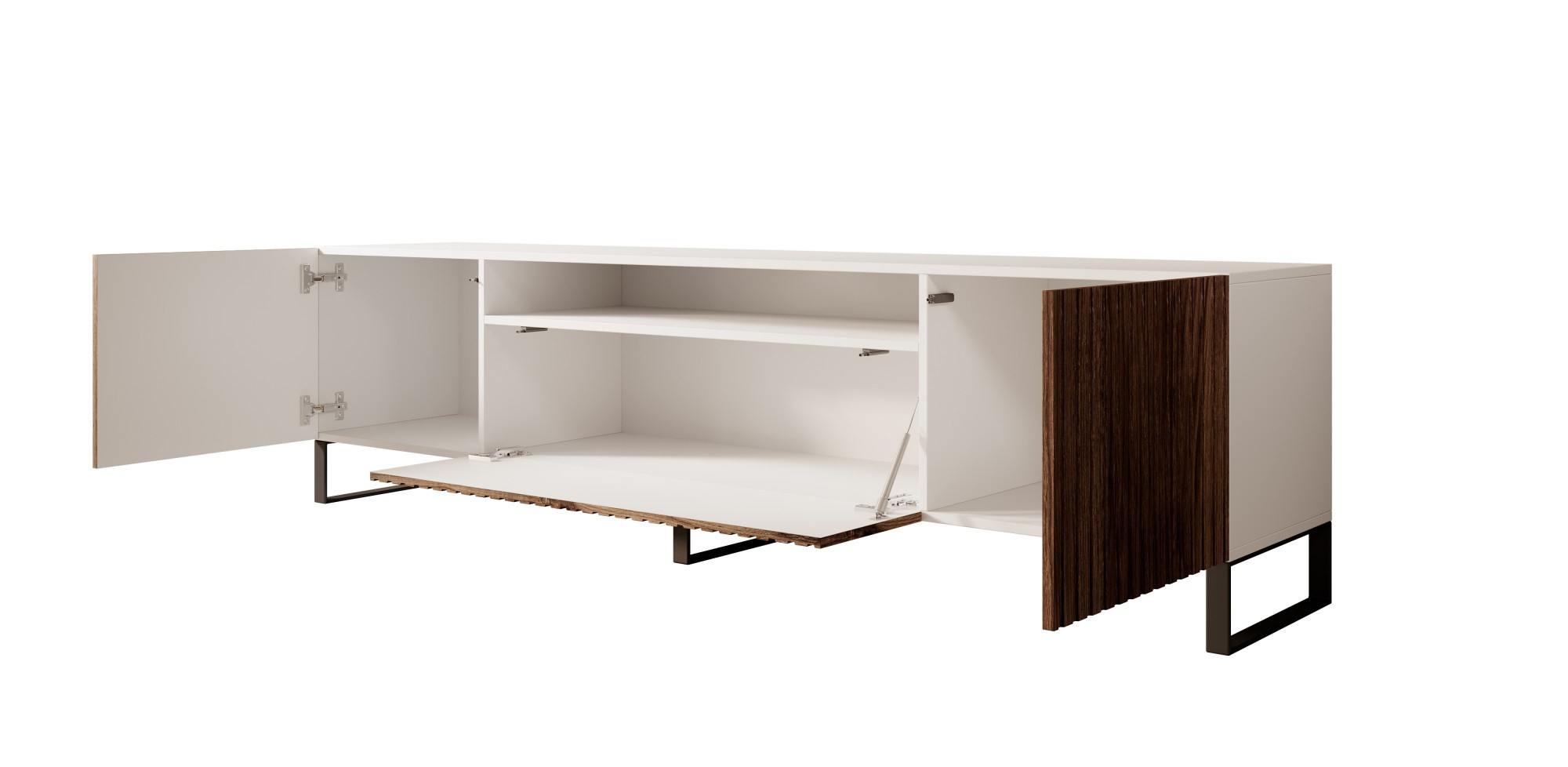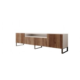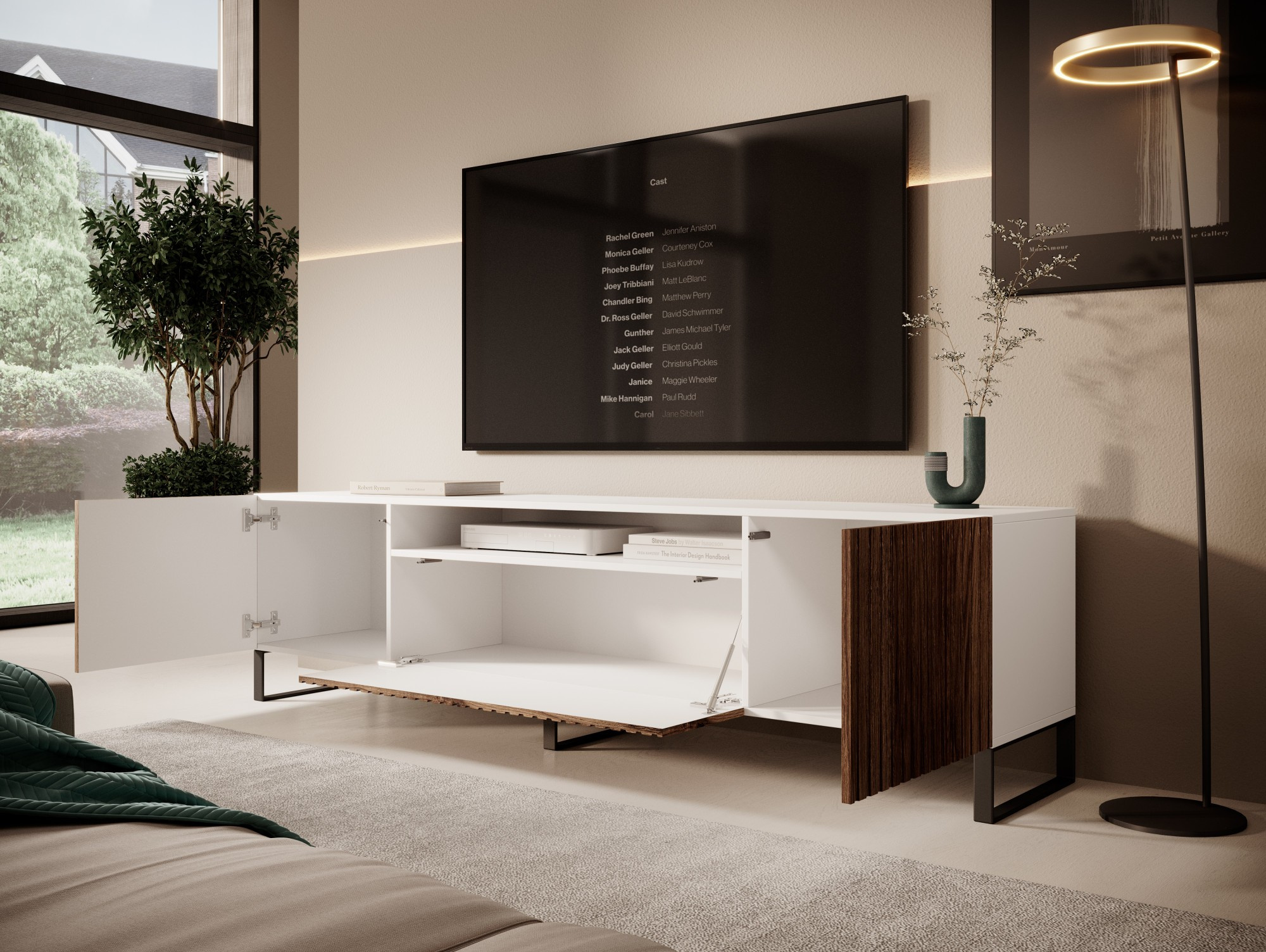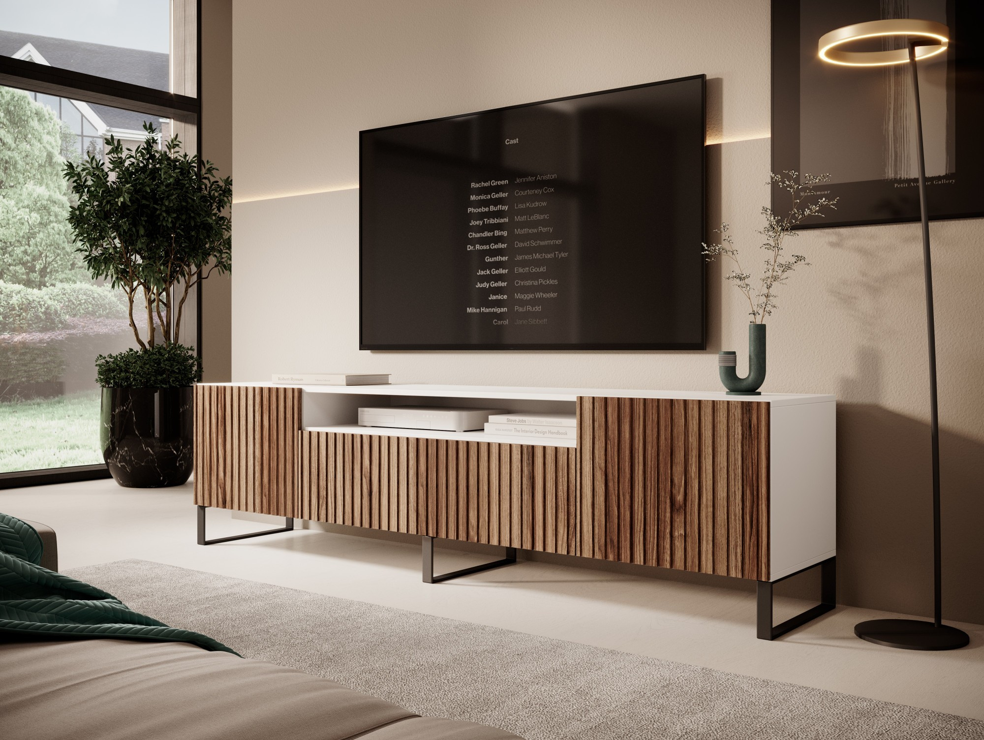Skříňka RTV Miro – moderní řešení pro váš obývací pokoj, které spojuje eleganci s funkčností. Model je k dispozici ve dvou barevných variantách: klasické bílé s dekorem katania a stylové černé s dekorem katania, dokonale ladí s různými styly interiérů.Televizní skříňka Miro je nabízena jak ve stojící, tak i v závěsné verzi, což umožňuje přizpůsobení vaší prostoru a individuálním preferencím uspořádání. Vysoce kvalitní materiály, včetně odolné laminované desky, zaručují nejen trvanlivost, ale také elegantní vzhled na dlouhá léta. Skříňka má prostorné police a praktické výklenky, které pojmou všechna zařízení RTV a doplňky, zajišťují pořádek a snadný přístup k potřebným zařízením.RTV Miro je ideální volbou pro osoby, které si cení stylu a pohodlí.