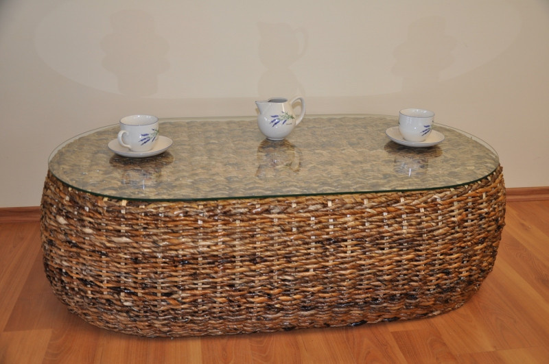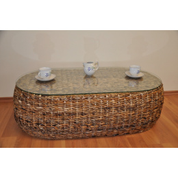 Stolek Baverly vyrobený z přírodního ratanu s výpletem listu banánovníku. | Konstrukce stolku je vyrobena z masivních ratanových tyčí, výplet je tvořen ze svazků listu banánovníku v přírodní hnědé barvě. Velikost stolku je 102x55x31 cm