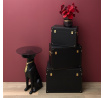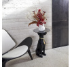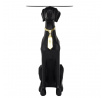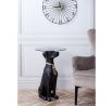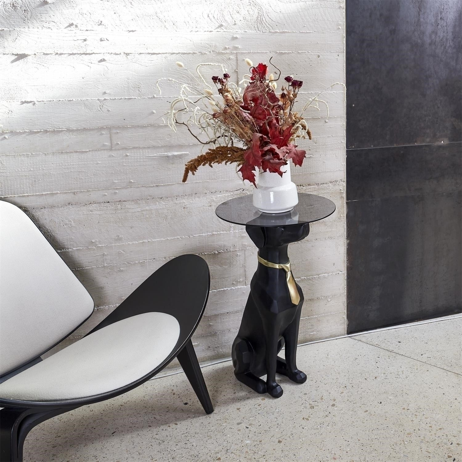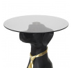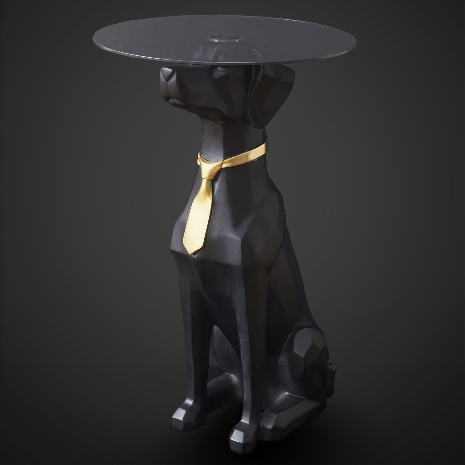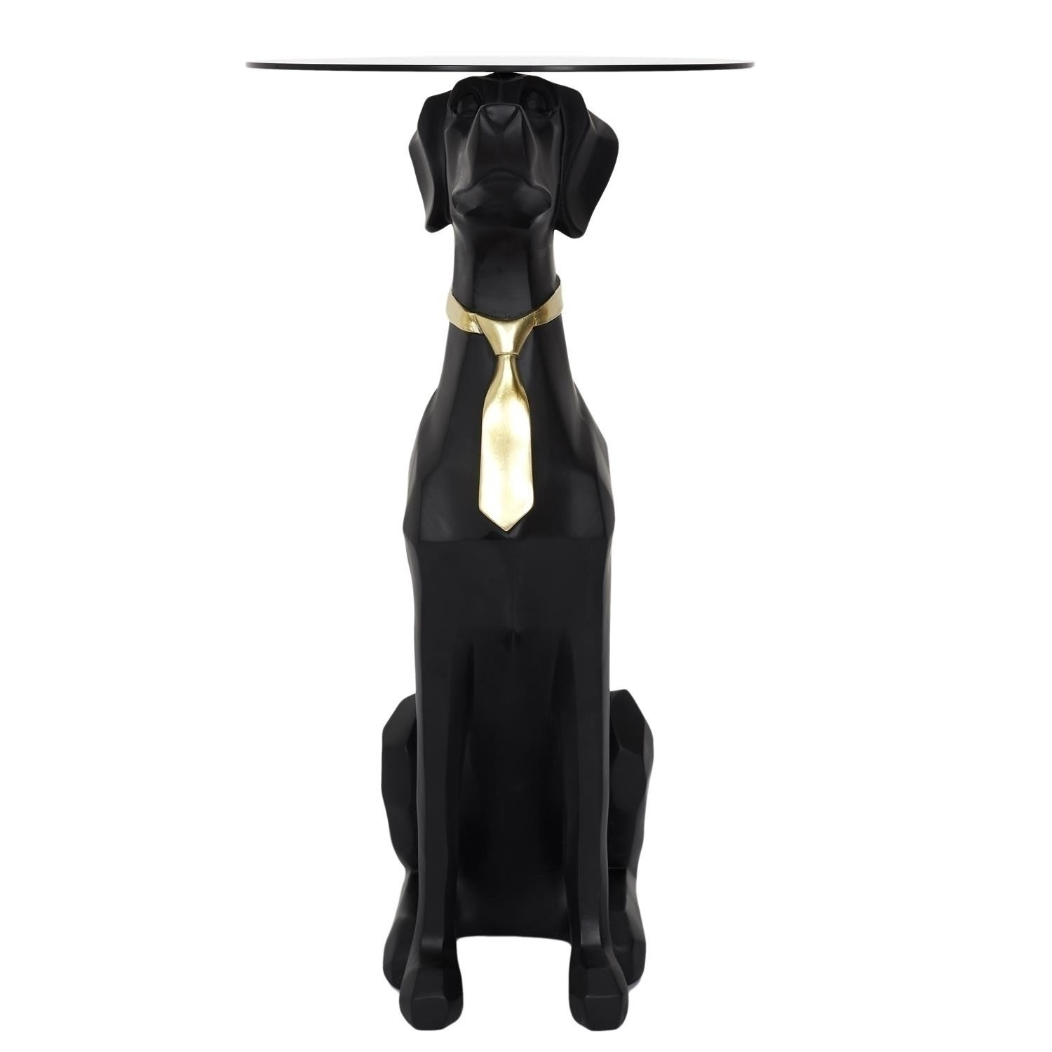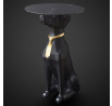 Stolek se skleněnou deskou a podstavcem ve tvaru psa je moderní nábytek pro neobyčejný interiér. Kulatá deska o průměru 40 cm byla umístěna na podstavci ve tvaru sedícího psa. Základna byla vyrobena z materiálu imitujícího černý broušený beton. Kouzlo celku dodává kravata natřená zlatou barvou, která odkazuje na interiéry ve stylu glamour. Hmotnost stolku: 7 kg, Rozměry balení: 76x45x36 cm