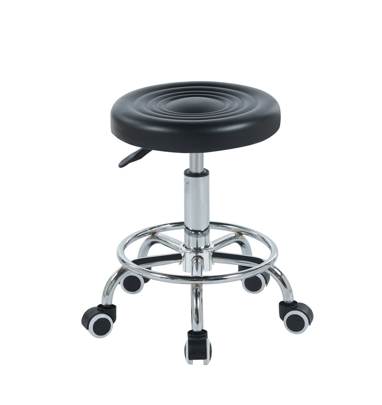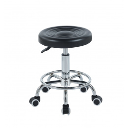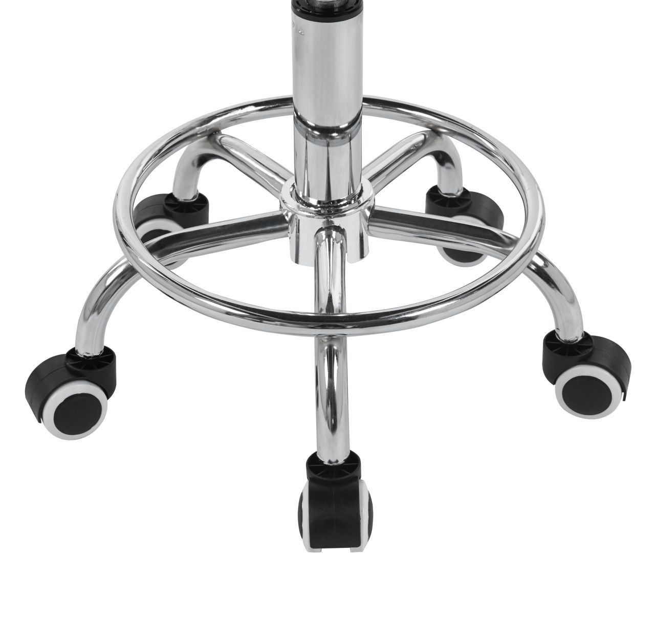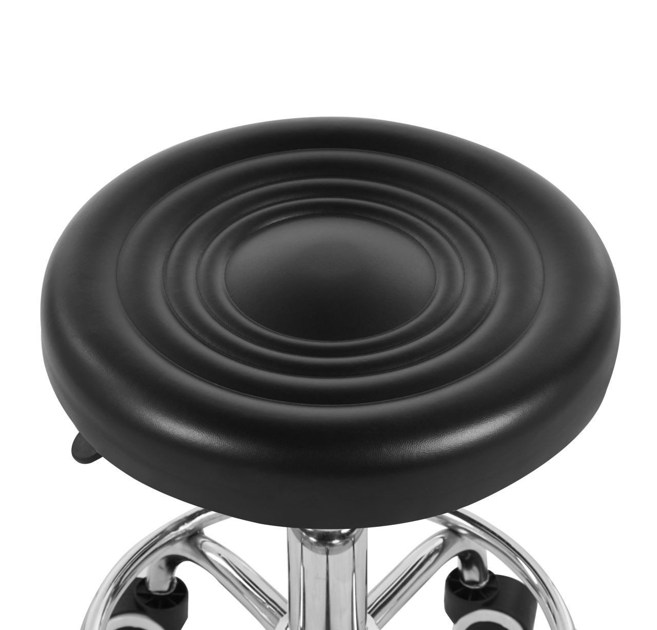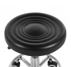 Rozměry: - průměr sedáku: 43 cm - nastavitelná výška: 44-56 cm Materiál - sedák: ekokůže PVC - základna: chromovaný kov Barva: - sedák: černý - základna: stříbrná