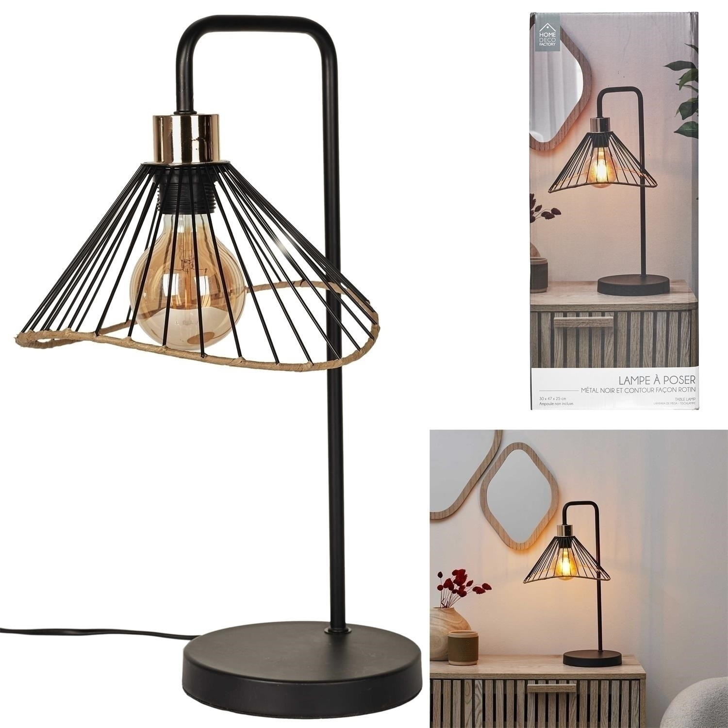 Stolní lampa v loftovém stylu s ratanovým povrchem se ideálně hodí pro dlouhé večery. Lampa vyrobená z kovu ozdobeného ratanovým provázkem. Závit žárovky E27 Max. výkon žárovky: 40W (Žárovka není součástí balení) Délka kabelu 200cm