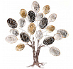 Nástěnná kovová dekorace ve tvaru stromu s lístky v odstínech stříbrné, černé a zlaté barvy.