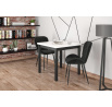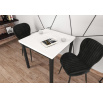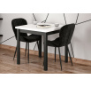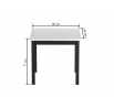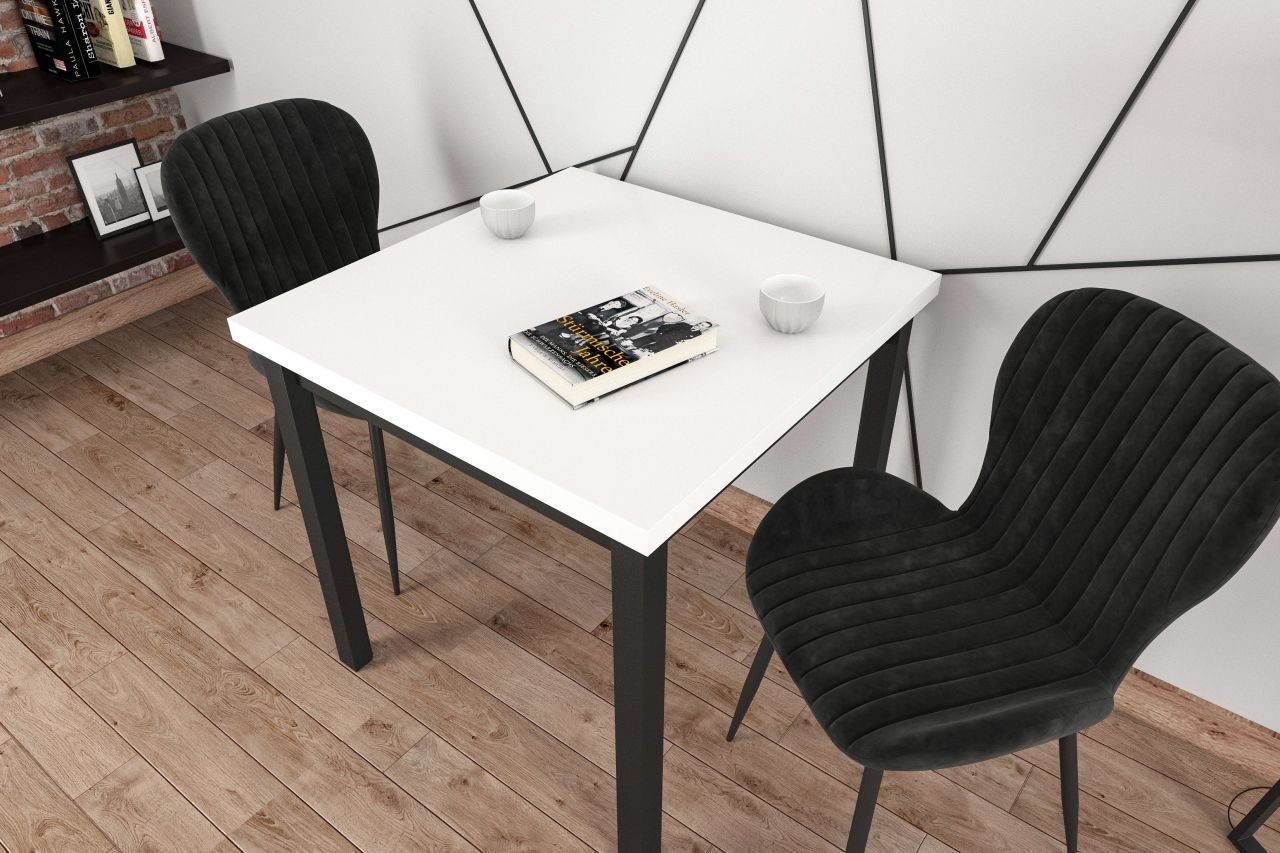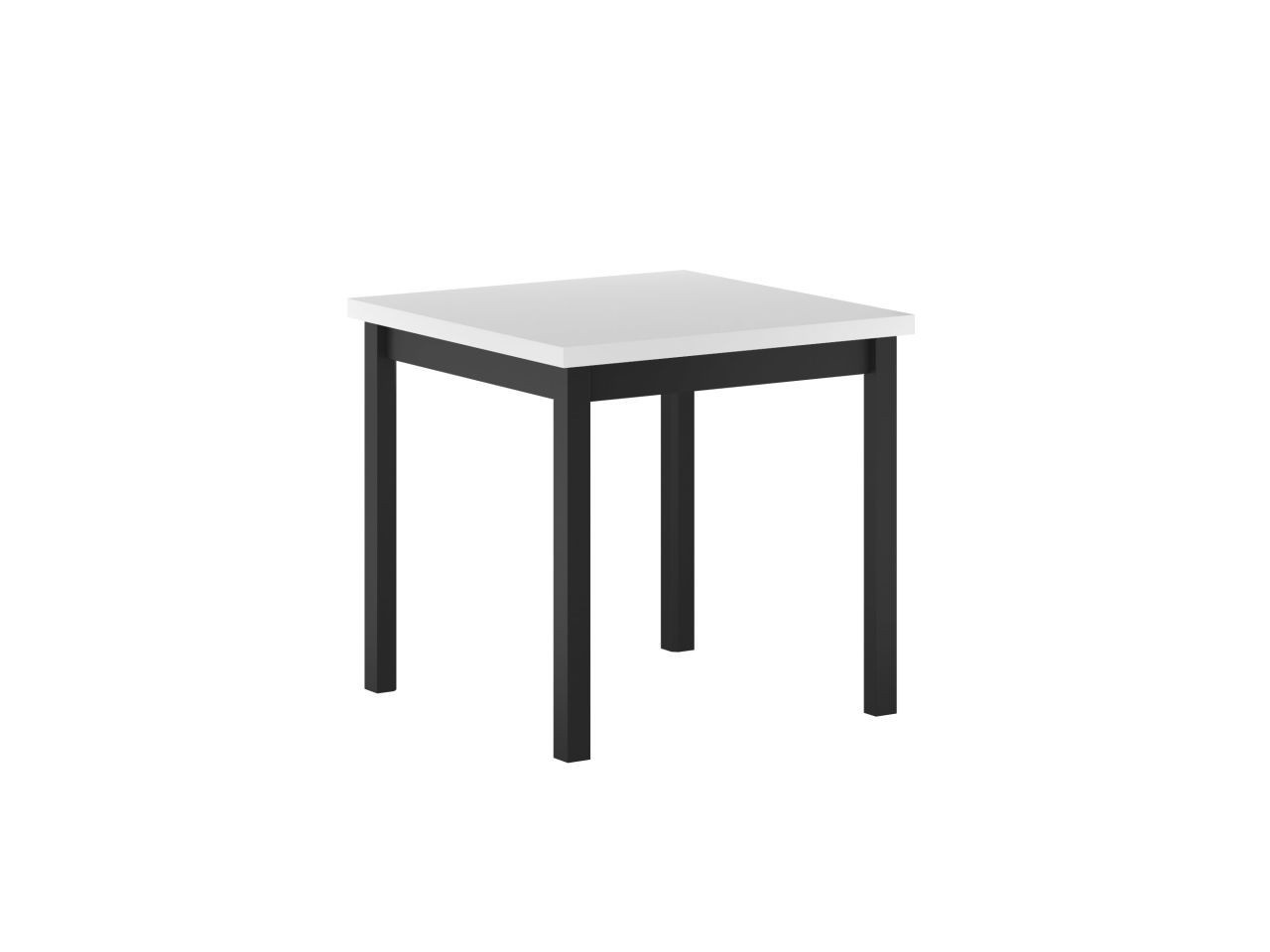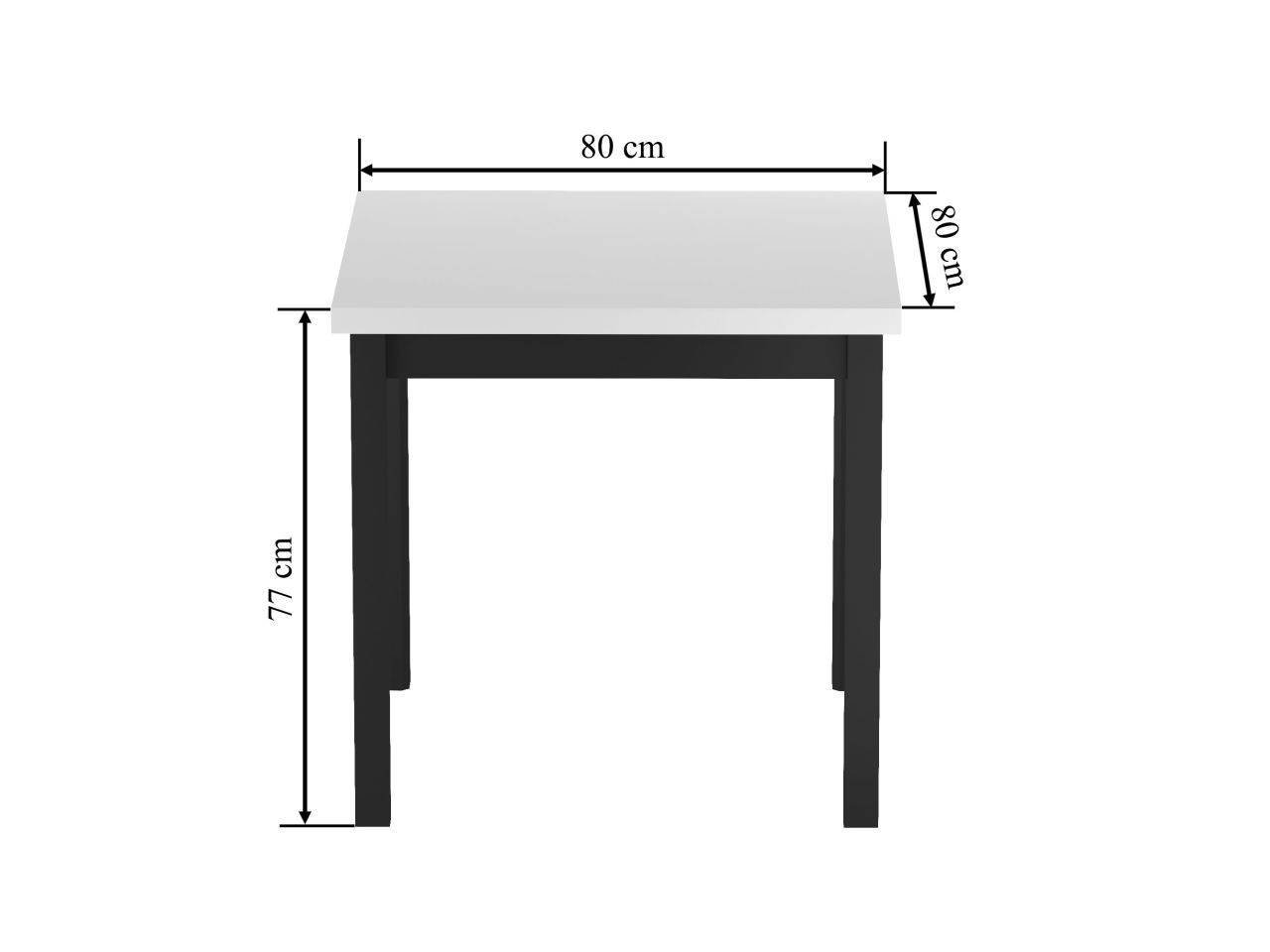Rozměry: - délka: 80 cm - šířka: 80 cm - výška: 77 cm - tloušťka desky: 3,8 cm Materiál: - deska: laminovaná dřevotříska - nohy: MDF - hrany desky: zakončené ABS plastem Barva: - bílá + černá