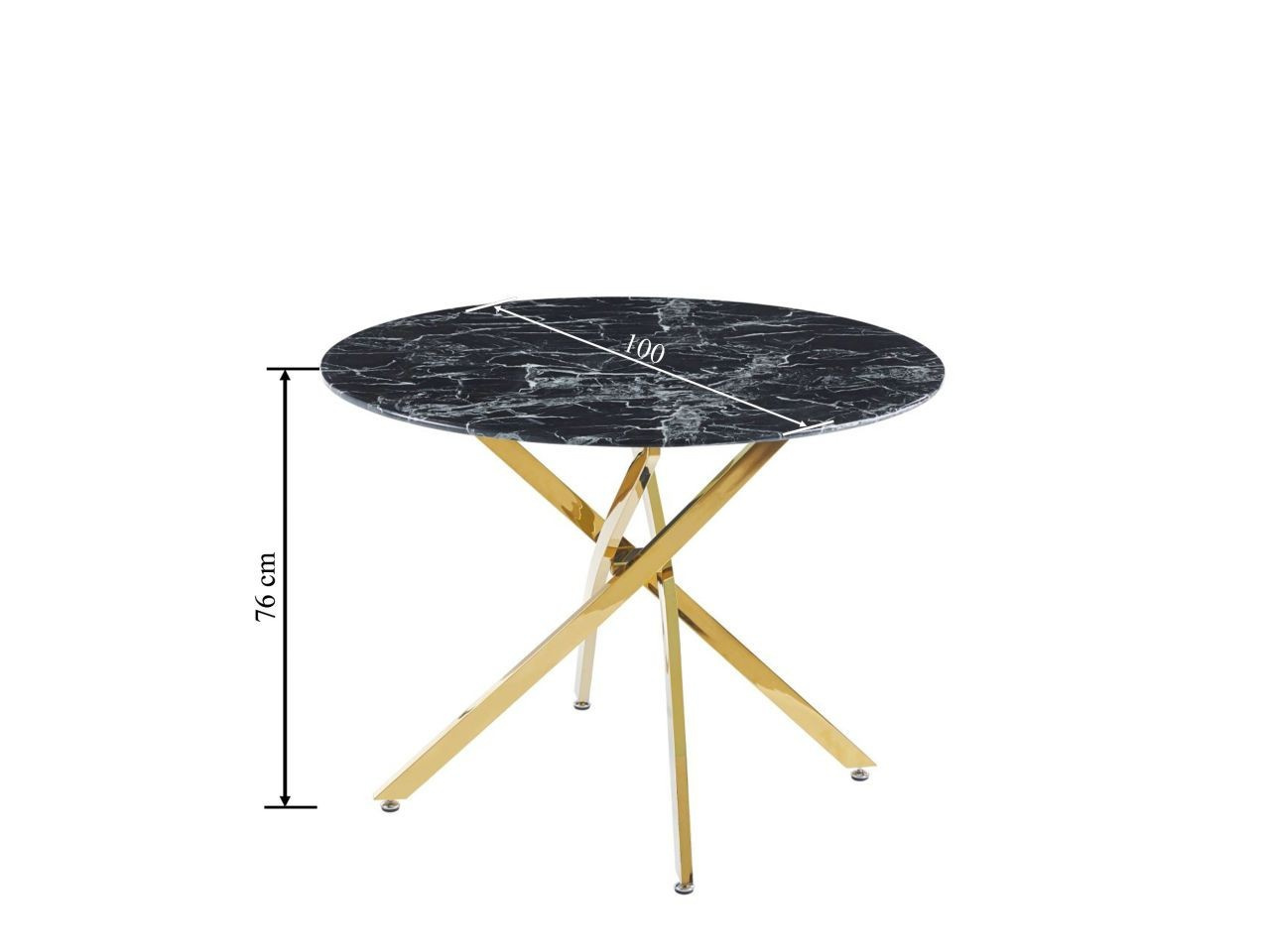 Rozměry: - délka: 100 cm - šířka: 100 cm - výška: 75 cm Materiál: - deska: sklo - nohy: chromovaná ocel Barva: - deska: černý mramor - nohy: zlaté