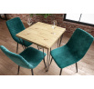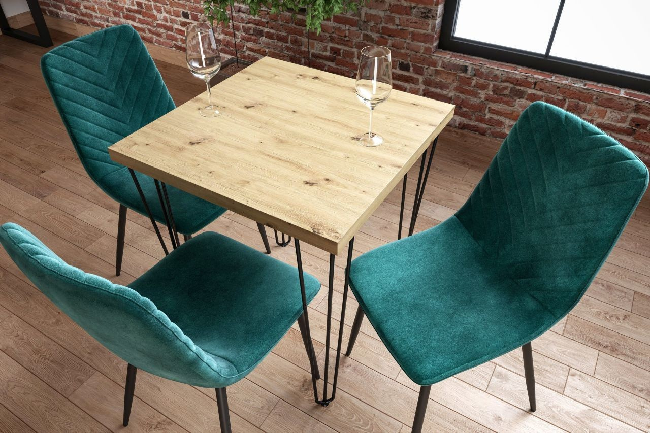 Rozměry: - délka: 67 cm - šířka: 67 cm - výška: 76 cm - tloušťka desky: 3,8 cm Materiál: - deska: laminovaná deska - hrany desky: zakončené ABS plastem - nohy: ocel lakovaná práškovou barvou Barva: - deska: dub artisan - nohy: černá