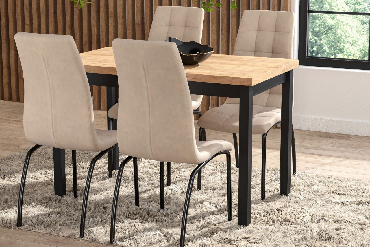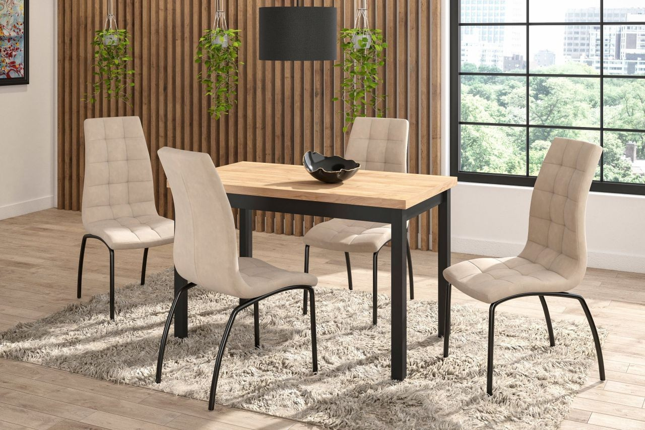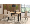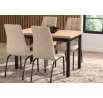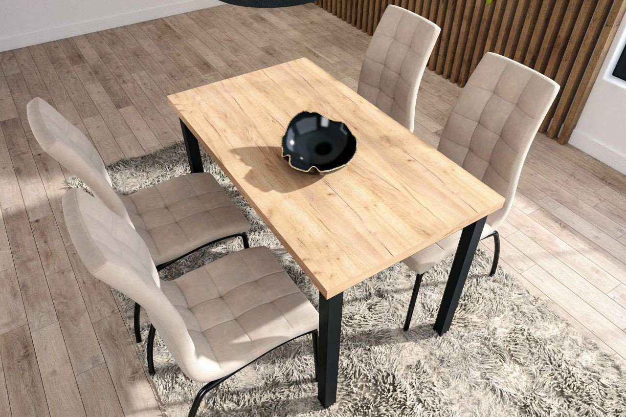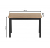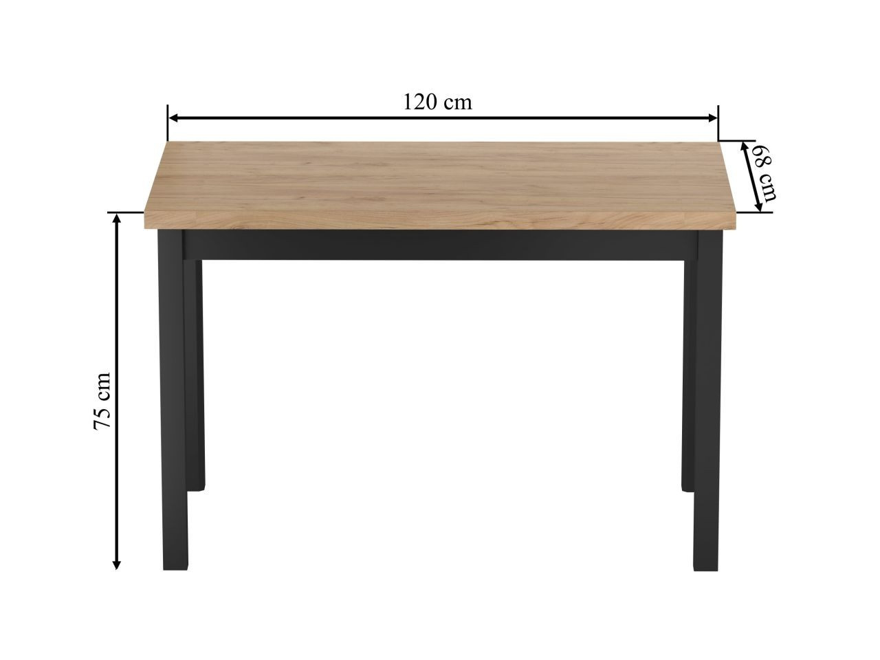 Rozměry: - délka: 120 cm - šířka: 68 cm - výška: 77 cm - tloušťka desky: 3,8 cm Materiál: - deska: laminovaná dřevotříska - nohy: MDF - hrany desky: zakončené ABS plastem Barva: - zlatý dub craft + černá
