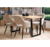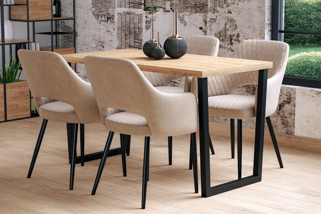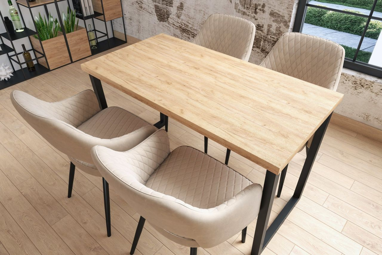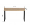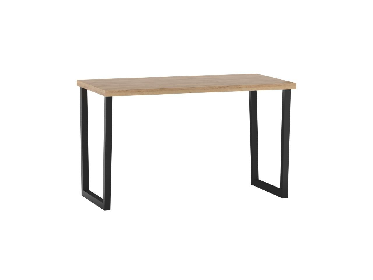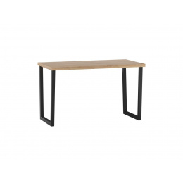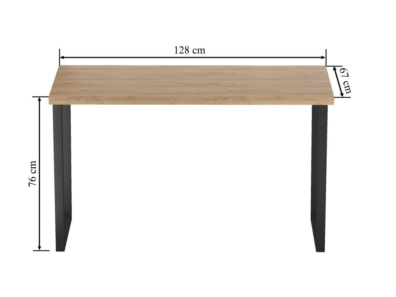 Rozměry: - délka: 128 cm - šířka: 67 cm - výška: 76 cm - tloušťka desky: 3,8 cm Materiál: - deska: laminovaná deska - hrany desky: zakončené ABS plastem - noha: ocel lakovaná práškovou barvou Barva: - deska: dub zlatý craft - noha: černá