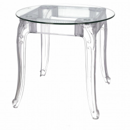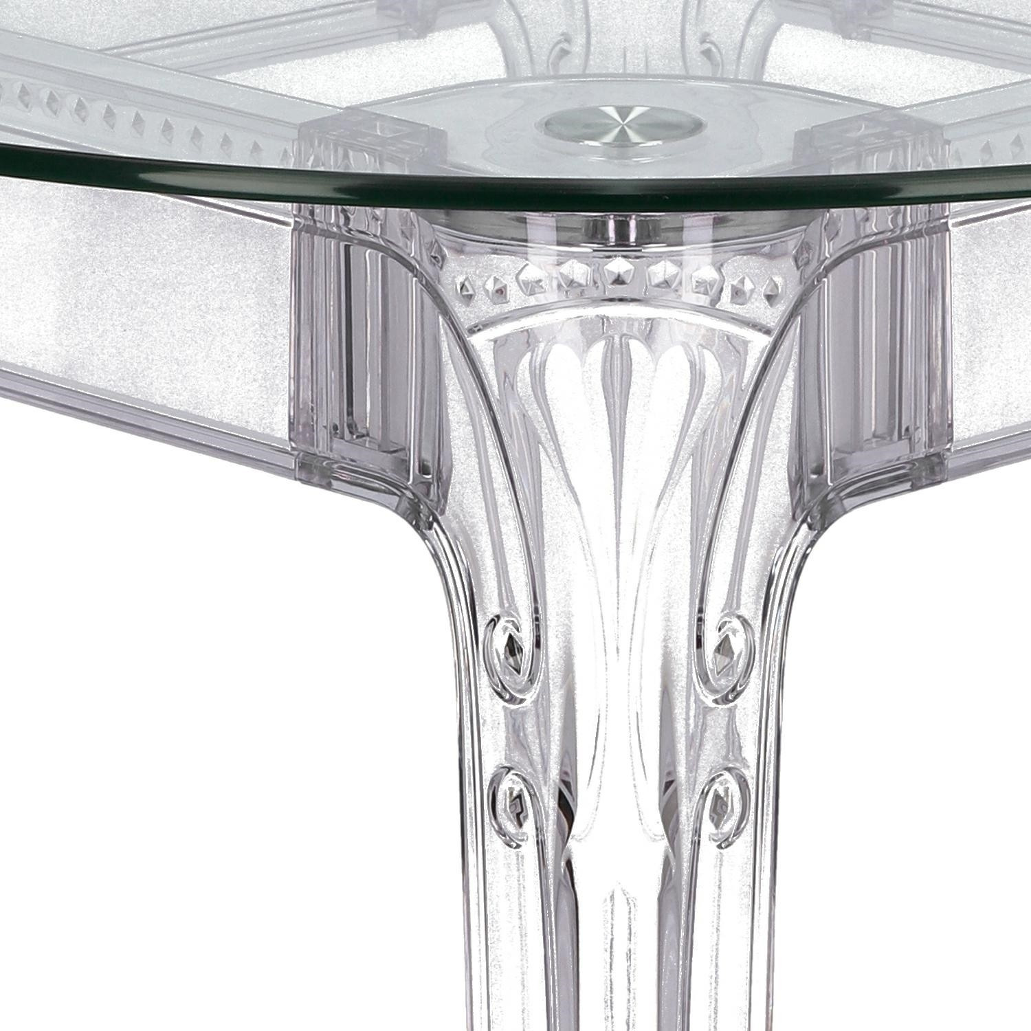 Stůl Ghost je kombinací klasické až barokní formy a moderní techniky a odolných materiálů. Stůl Ghost má skleněnou desku o tloušťce 10 mm, kterou podpírají bohatě zdobené polykarbonátové nohy. Polykarbonát je velmi odolný materiál s širokým využitím. Díky tomu, že nohy stolu byly vyrobeny z umělé hmoty, jsou odolné vůči mechanickému poškození, poškrábání a vlhkosti. Ghost je dokonalý stůl do malé jídelny, kuchyně nebo obývacího pokoje. Průhledná forma nábytku způsobuje, že nezahlcuje místnost, naopak odráží světlo a interiér se zdá být větší. Tloušťka desky: 10 mm Tloušťka nohou: od 5 do 8,5 cm Rozměry kartonu: 80x20x22 cm