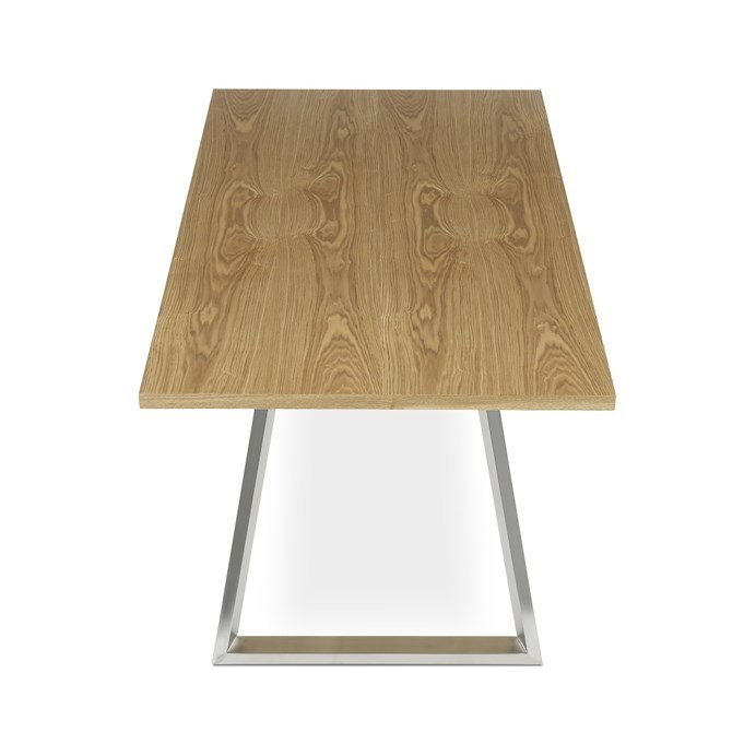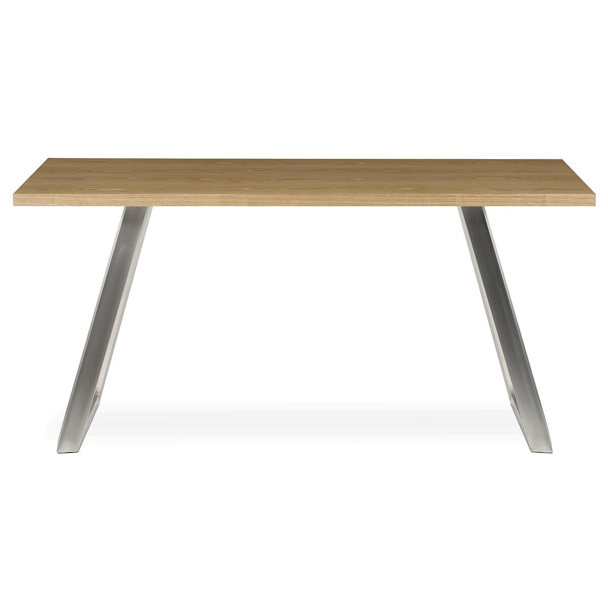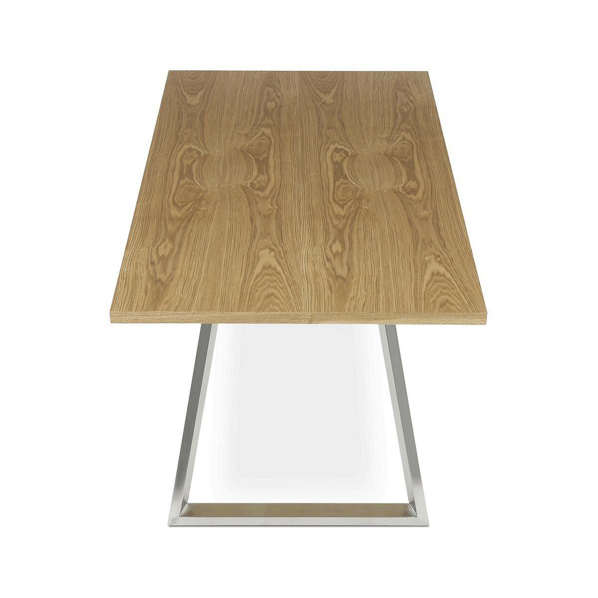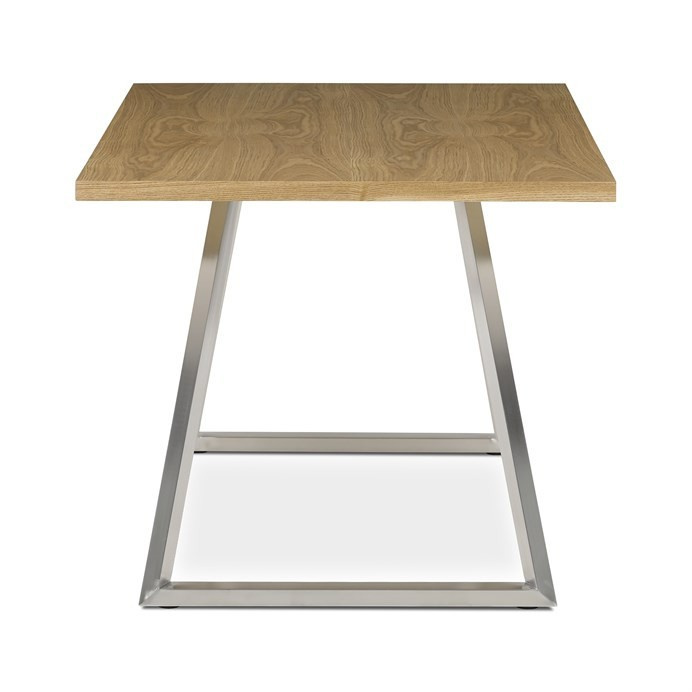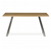 Jídelní stůl HT-W1515 OAK kombinuje přírodní vzhled dubové dýhy s moderním provedením broušeného nerezu, který tvoří stabilní kovovou podnož. Deska stolu o rozměrech 160 × 90 cm je vyrobena z MDF s vrchní vrstvou dýhy v matném hnědém odstínu, což zajišťuje příjemnou strukturu a snadnou údržbu povrchu. Pevná kovová podnož v designu lichoběžníkových rámů poskytuje vysokou stabilitu a odolnost při každodenním používání. Výška 75 cm odpovídá standardním ergonomickým parametrům pro pohodlné stolování. Celkově je stůl navržen tak, aby spojil estetiku přírodního dřeva s funkčností moderního kovového základu.