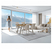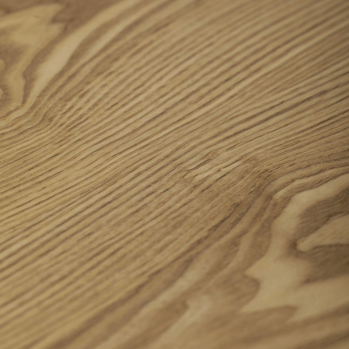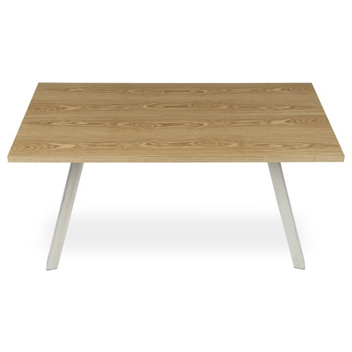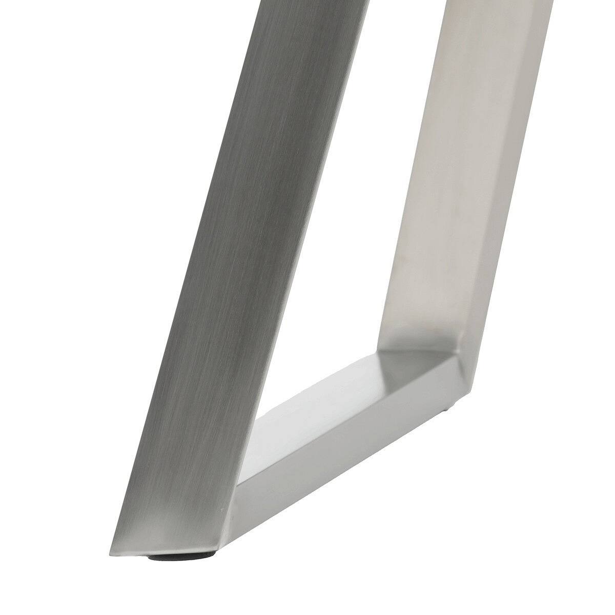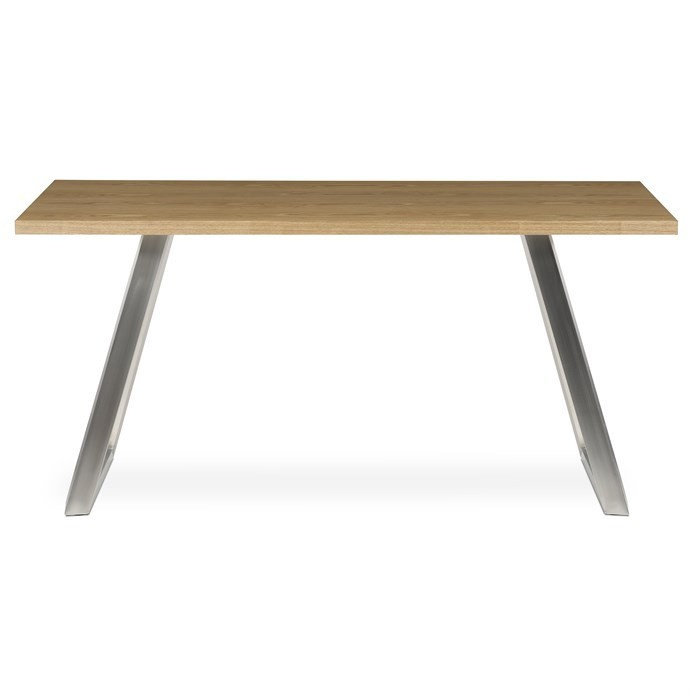 Jídelní stůl HT-W1515 OAK kombinuje přírodní vzhled dubové dýhy s moderním provedením broušeného nerezu, který tvoří stabilní kovovou podnož. Deska stolu o rozměrech 160 × 90 cm je vyrobena z MDF s vrchní vrstvou dýhy v matném hnědém odstínu, což zajišťuje příjemnou strukturu a snadnou údržbu povrchu. Pevná kovová podnož v designu lichoběžníkových rámů poskytuje vysokou stabilitu a odolnost při každodenním používání. Výška 75 cm odpovídá standardním ergonomickým parametrům pro pohodlné stolování. Celkově je stůl navržen tak, aby spojil estetiku přírodního dřeva s funkčností moderního kovového základu.