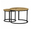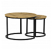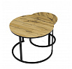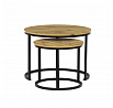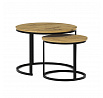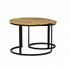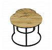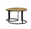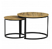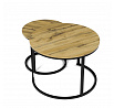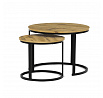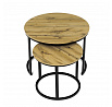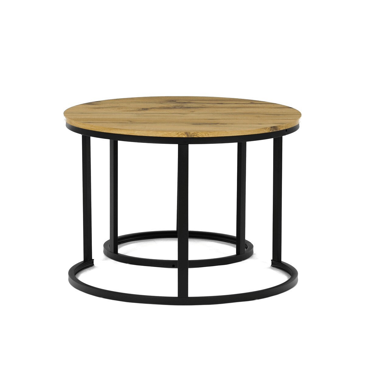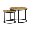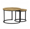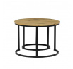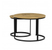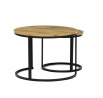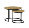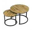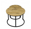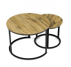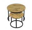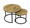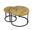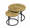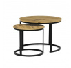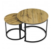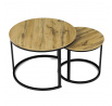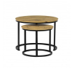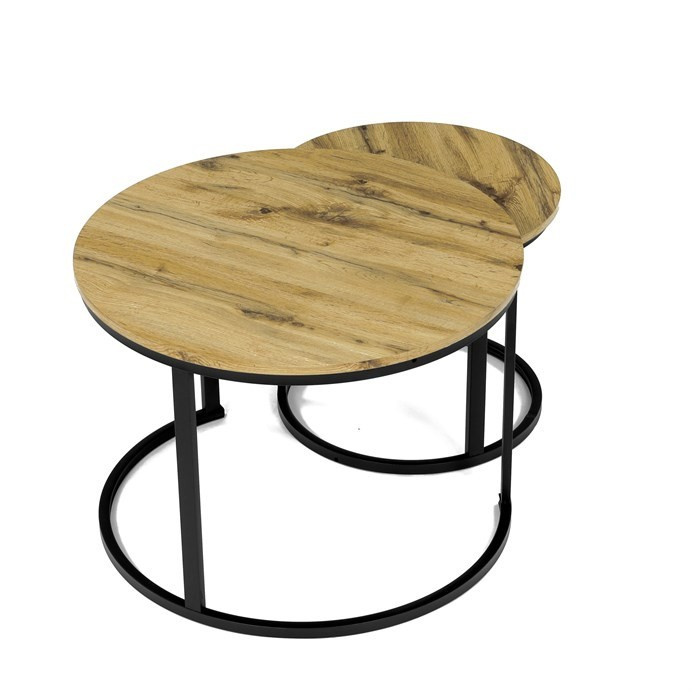 Konferenční stoly v setu dvou kusů kombinují desky z MDF s dekorem divokého dubu a pevnou kovovou podnož v černém matném laku. Kulaté desky s přírodními hnědými odstíny jsou navrženy s ohledem na snadnou údržbu a odolnost proti poškrábání. Kovová podnož tvoří stabilní kruhový rám, který zajišťuje pevnost a stabilitu stolů. Výška většího stolu je 50 cm, což umožňuje pohodlné použití v obývacím prostoru jako praktický doplněk k sedací soupravě. Menší stůl lze díky kompaktním rozměrům snadno zasunout pod větší, čímž šetří místo a nabízí variabilní uspořádání.