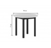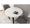 Rozměry: - průměr: 90 cm - výška: 77 cm - tloušťka desky: 3,8 cm Materiál: - deska: laminovaná dřevotříska - nohy: MDF - hrany desky: zakončené ABS plastem Barva: - bílá + černá