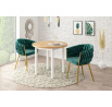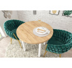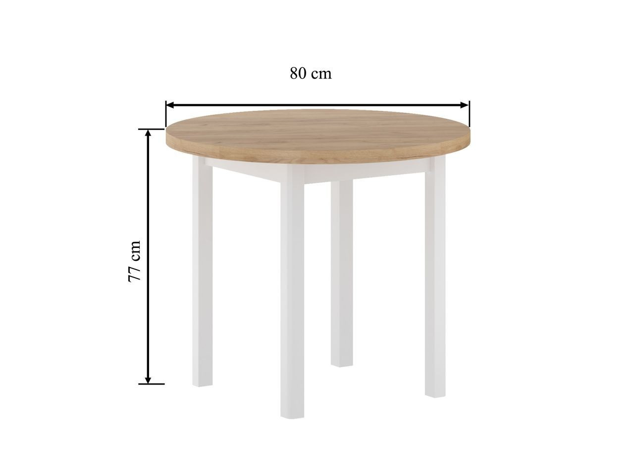 Rozměry: - průměr: 80 cm - výška: 77 cm - tloušťka desky: 3,8 cm Materiál: - deska: laminovaná dřevotříska - nohy: MDF - hrany desky: zakončené ABS plastem Barva: - zlatý dub craft + bílá