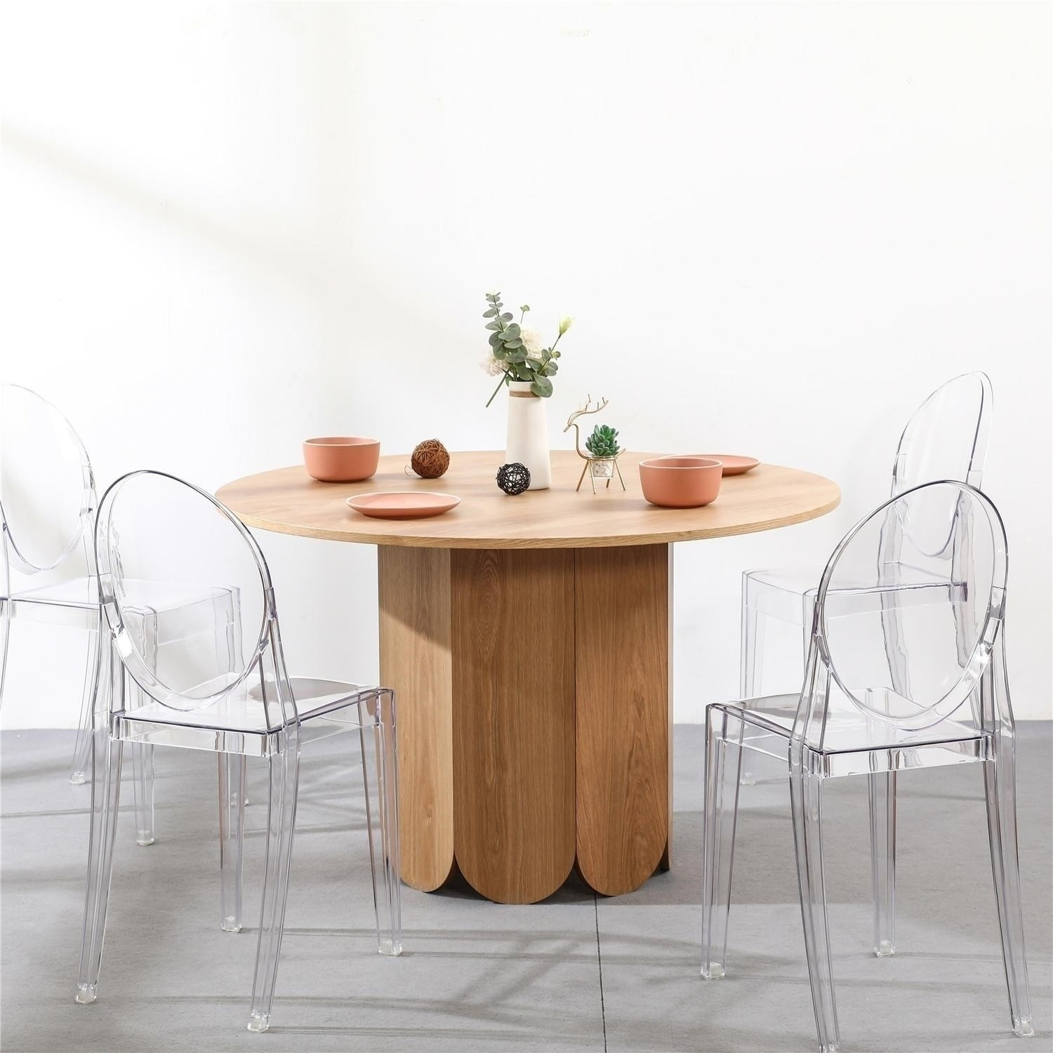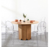Stůl Puro v barvě dubu je kombinací funkčnosti a stylu boho. Designový, kulatý stůl je nadčasový kus nábytku, který se hodí jak do boho, tak do skandinávských interiérů. Stůl s kulatou deskou o průměru 90 cm je vybaven jednou, pevnou nohou s osmiúhelníkovým průřezem. Boky nohou stolu o šířce 20 cm byly zakončeny jemným zaoblením. Široká, moderní základna stolu je velmi odolná deska MDF ozdobená dýhou realisticky napodobující dubové dřevo. Deska stolu ve stejné barvě ladí s celkem. Stůl byl zespodu zabezpečen černými nožičkami z plastu Balíky: 98x99x8;25,0KG, 82x48x22;15,0KG