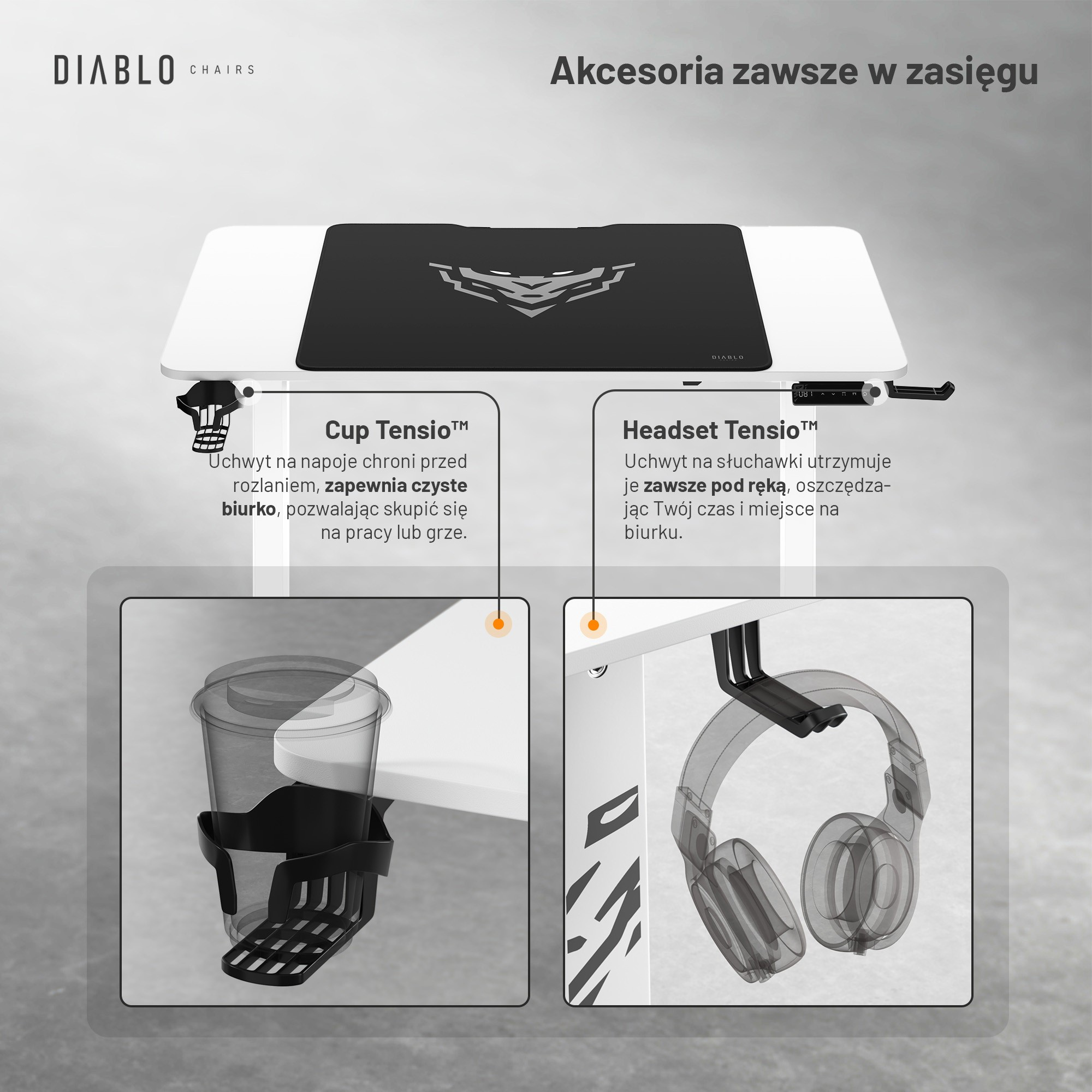 Už žádné rozlité nápoje a zamotané kabely! Stůl X-Tensio je vybaven praktickými držáky na sluchátka a hrnek, které vám ušetří cenné místo na stole a zajistí, že vaše oblíbené příslušenství bude vždy po ruce. Užijte si uklizený a organizovaný pracovní prostor, který vám umožní soustředit se na to, co je důležité.