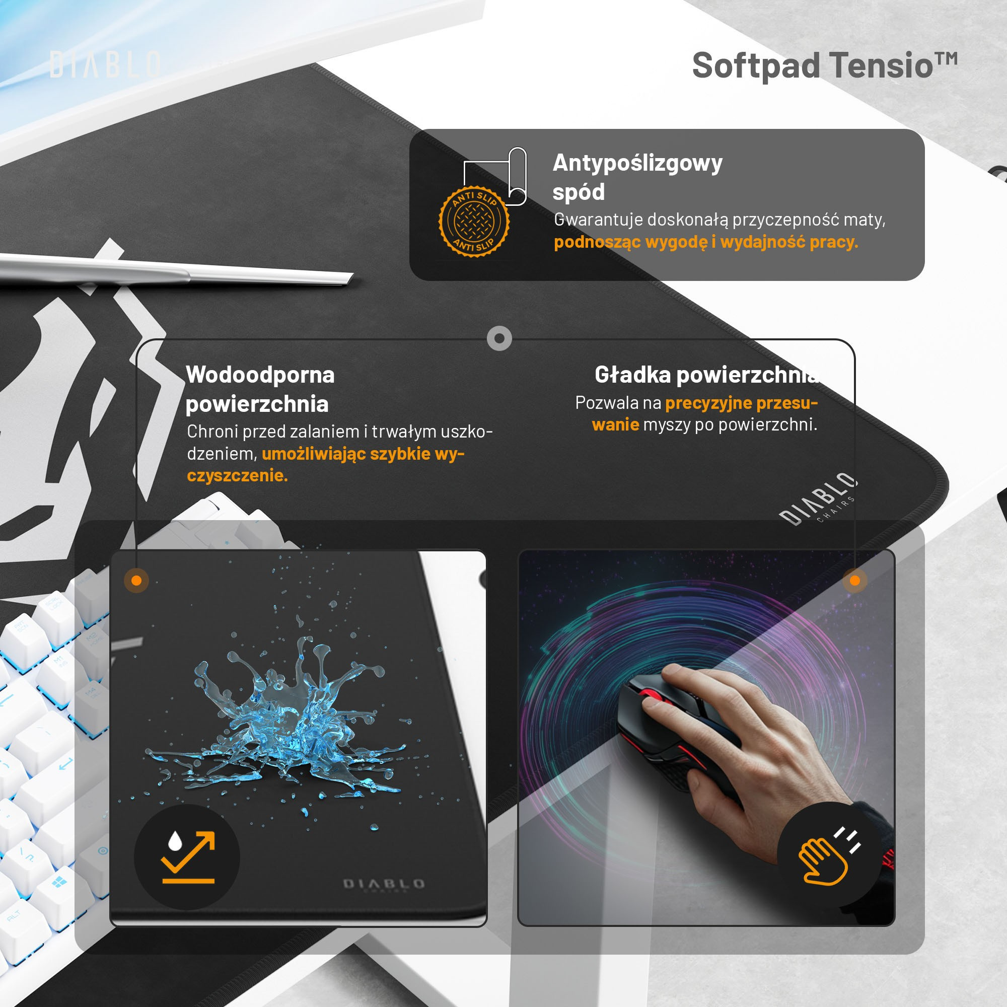 Prostorná deska stolu X-Tensio vám poskytne dostatek místa pro všechny vaše pracovní potřeby. A co víc, součástí je i podložka Chairs, která dodá vašemu pracovnímu prostoru dravý a stylový vzhled. Hladký povrch podložky usnadňuje pohyb myši a protiskluzová spodní strana zaručuje ideální přilnavost k desce stolu. Voděodolné vlastnosti podložky navíc usnadňují údržbu a zajišťují, že váš stůl bude vždy čistý a reprezentativní.