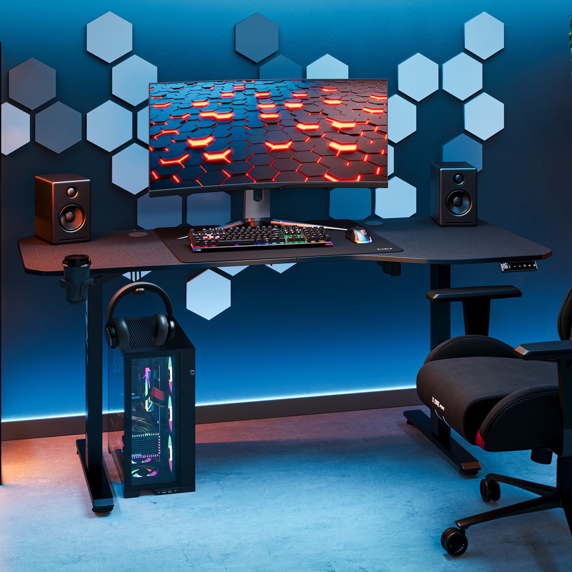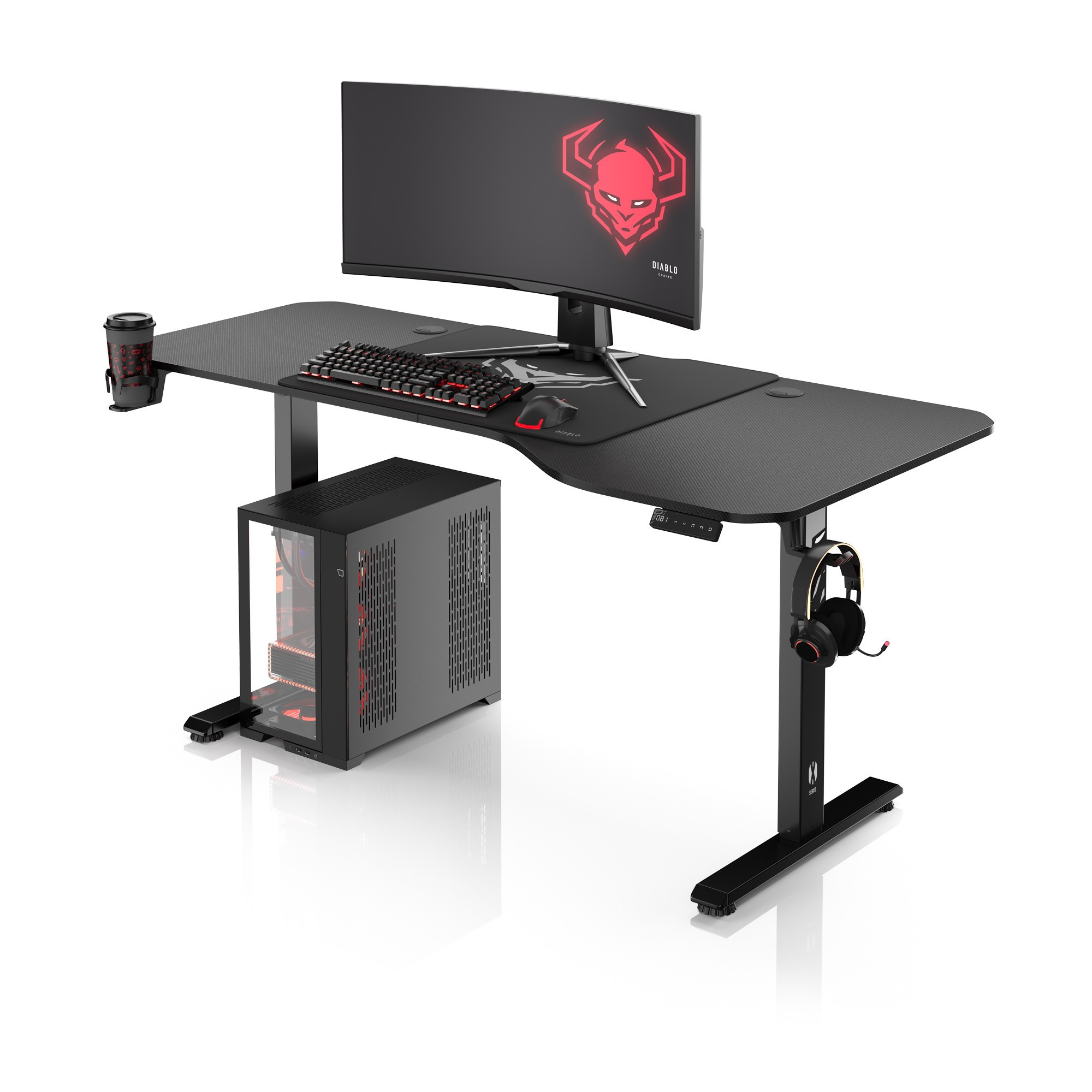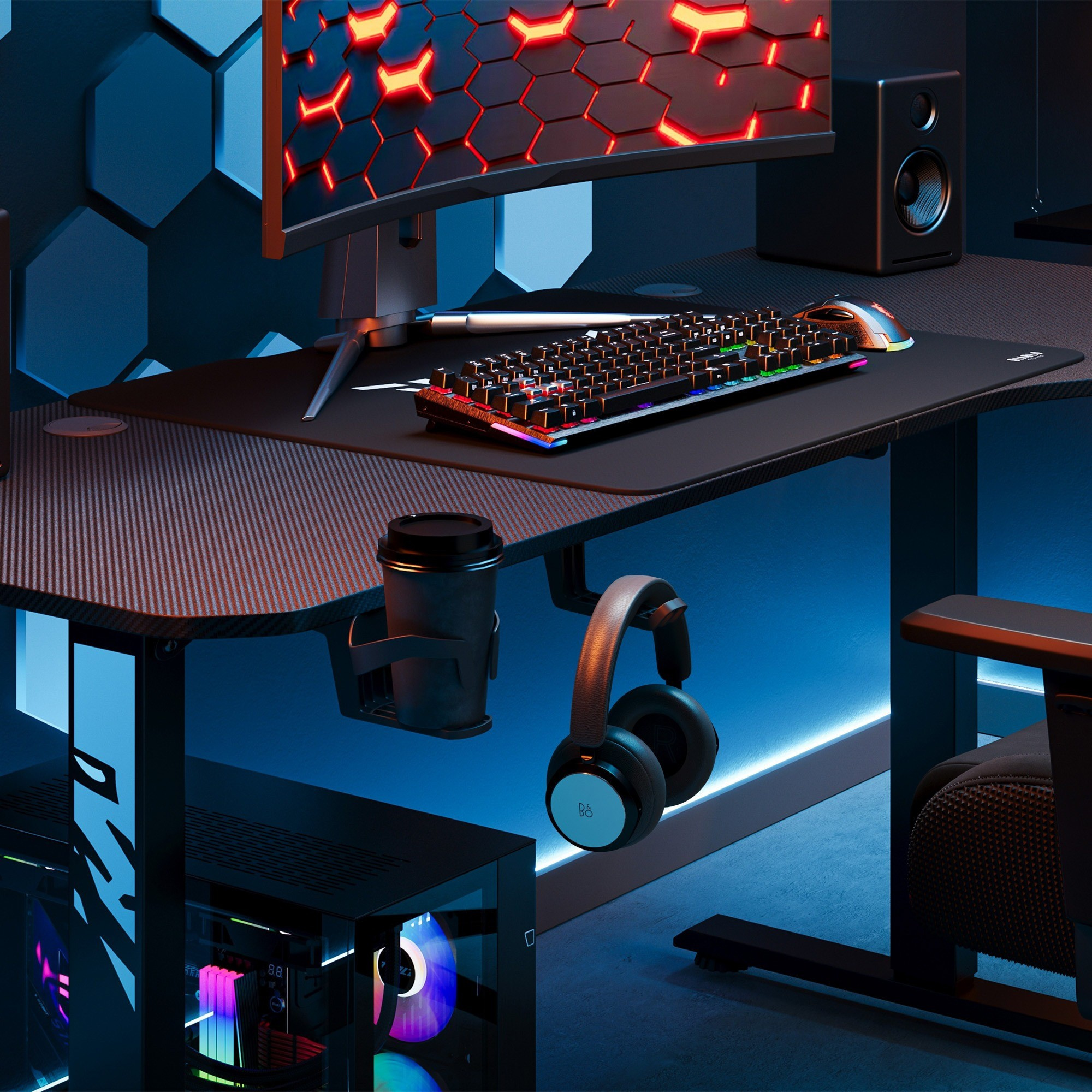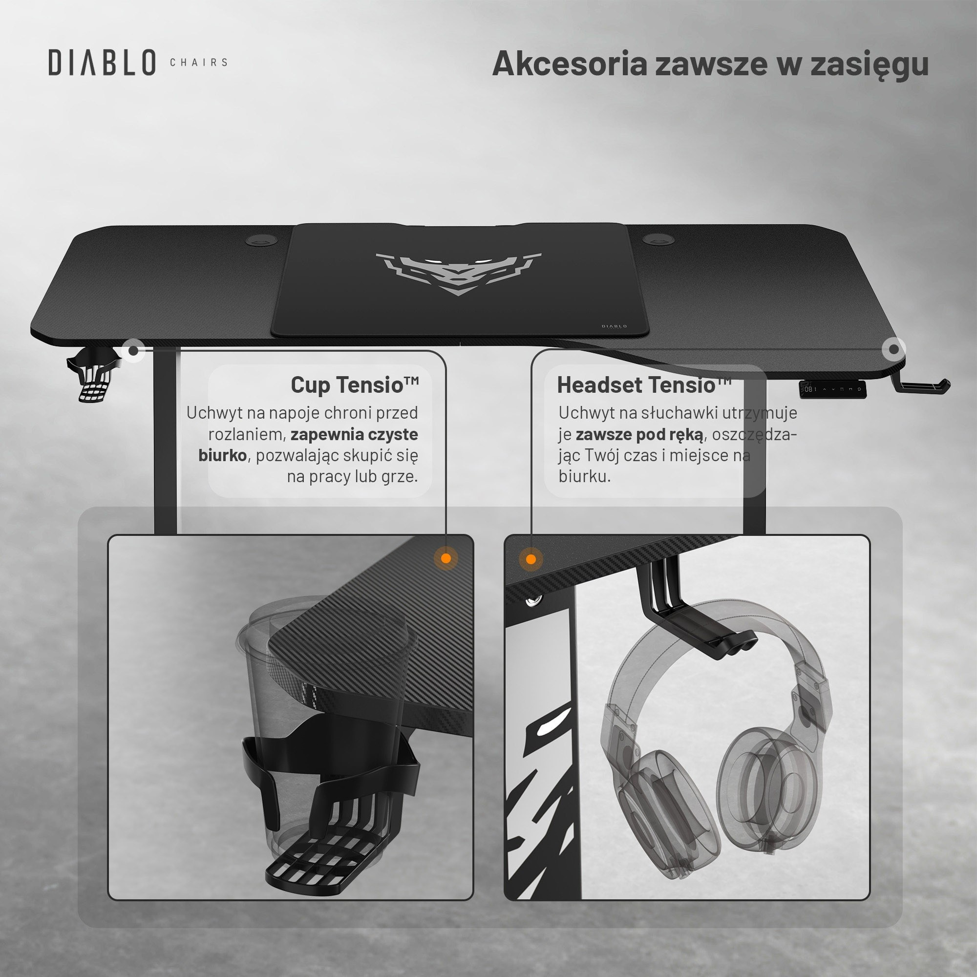 Udržujte svůj pracovní prostor uspořádaný a mějte vše, co potřebujete, na dosah ruky s praktickými držáky na hrnek a sluchátka. Už žádné rozlité nápoje a zamotané kabely – s X-Tensio budete mít vše pod kontrolou.