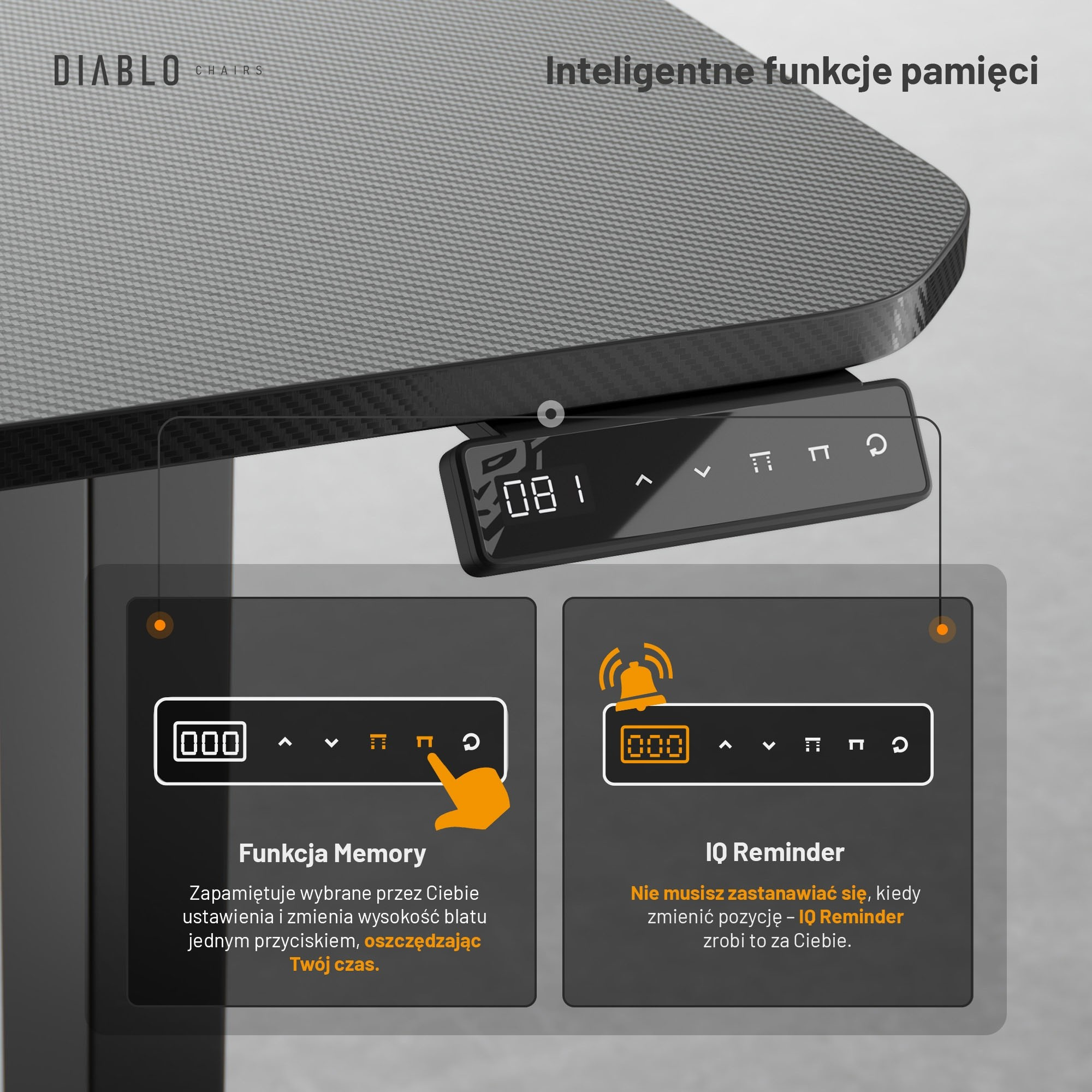 Nezapomínejte na pravidelnou změnu polohy s funkcí IQ Reminder. Tato chytrá funkce vám připomene, že je čas se postavit a protáhnout, čímž podpoří vaše zdraví a pohodu. Můžete si nastavit interval připomínání podle svých preferencí (30, 40 nebo 60 minut).
