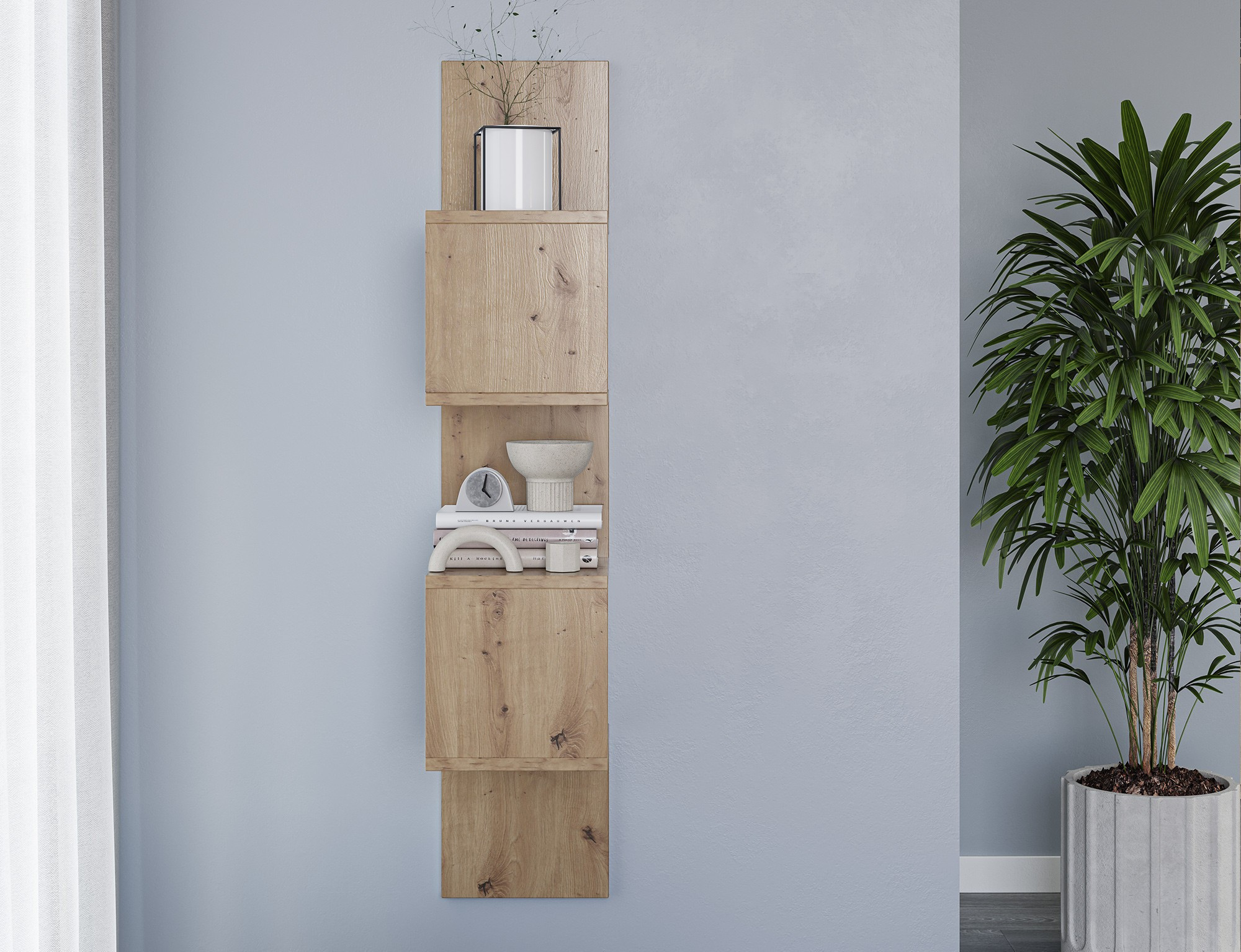 Polička Sunpedo je moderní a funkční prvek interiéru navržený s ohledem na eleganci a jednoduchost. S rozměry 25 cm na šířku, 25 cm do hloubky a 120 cm na výšku nabízí štíhlé a vysoké řešení pro ukládání a vystavování předmětů. Jeho vertikální tvar činí polici Sunpedo ideální pro menší prostory, kde je maximalizace dostupného prostoru nezbytná. Lze jej umístit do obývacího pokoje, ložnice, chodby nebo dokonce do kanceláře, čímž dodá každému interiéru moderní nádech. Polička je ideální pro vystavení knih, dekorací, fotografií a dokonce i rostlin.