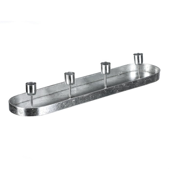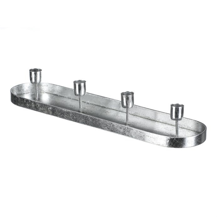 Kovový stříbrný svícen na čtyři kónické svíčky, v podobě elegantního oválného tácu, je ideálním doplňkem pro váš adventní stůl. Jeho prostý, a přesto vkusný design, dodá vaší sváteční výzdobě ten správný nádech elegance. Tento svícen je skvělým centrálním prvkem na vašem stole a zároveň vkusnou dekorací, která podtrhne vánoční magii a přinese do domova útulnou a slavnostní náladu.