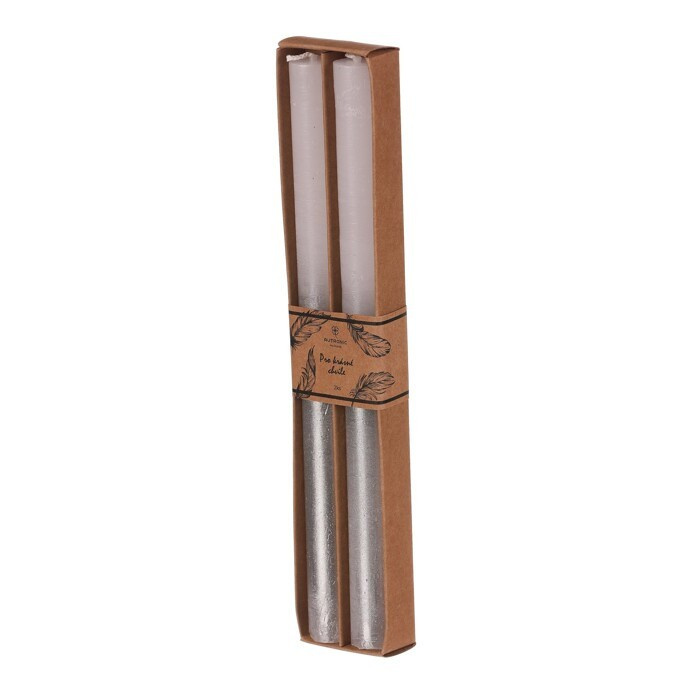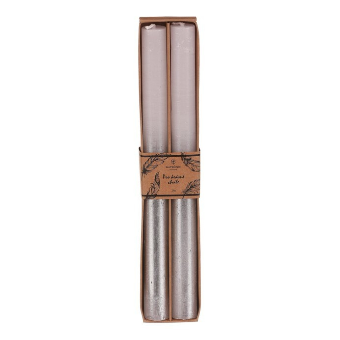 Navoďte si neodolatelnou atmosféru díky těmto kónickým svíčkám ze stoprocentního parafínu. Jejich nádherná kombinace barev stříbrné a bílé, přinášejí do vašeho prostoru nádech romantiky, relaxace a elegance. V jednom balení najdete vždy dvě svíčky jednoho druhu a stejných odstínech. S jejich výškou 25 cm a dobou hoření až 10 hodin vytvoříte úchvatnou atmosféru plnou živého světla, a to po dostatečně dlouhou dobu. Budou hezkým dekoračním doplňkem samy o sobě, ale jejich kouzlo bude vynikat samozřejmě zejména za temných večerů, kdy bude hořet jejich zapálený knot. Důrazně doporučujeme skladovat svíčky, a tím spíše je zapálené vystavovat, mimo dosah dětí.
