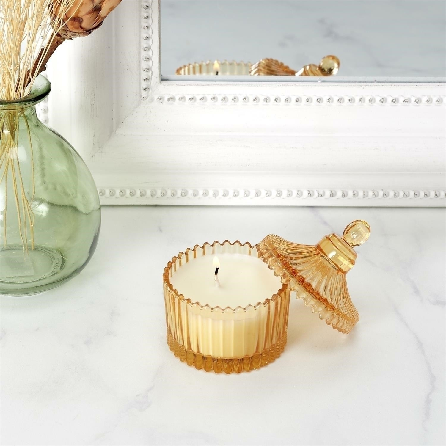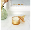Budeš okouzlen svíčkou ve svícnu inspirovaném bohémským sklem. Svíčka v nádobě s víčkem v sadě poskytuje nejen zajímavě rozptýlené světlo, když hoří. Svíčka je také fantastickou ozdobou, i když nehoří. Parfémovaná svíčka s vůní jantaru dodá příjemnou svěží vůni.- Skleněné pouzdro - Výdrž: 10 h - Hmotnost: 60 g
