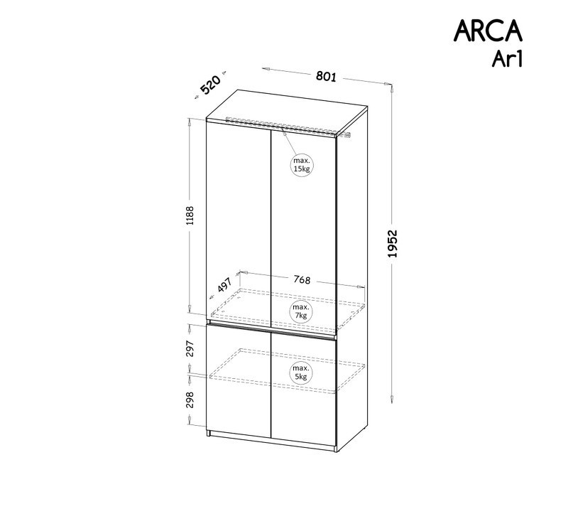 Šatní skříň Arca AR1 Rozměry: Šířka 80,1 cm Hloubka 52 cm Výška 195,2 cm Nábytek dostupný v barvách: Arktická bílá Arktická bílá / Dub Wotan Šatní skříň Arca je základním prvkem vybavení pokoje pro mládež. Je prostorná a funkční , protože má v horní části tyč na ramínka a ve spodní části police. Toto uspořádání umožňuje lepší využití prostoru uvnitř a usnadňuje udržování pořádku .