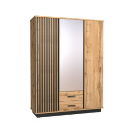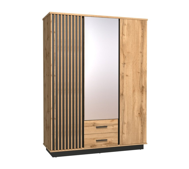 Třídveřová skříň se zrcadlem a dvěma zásuvkami.