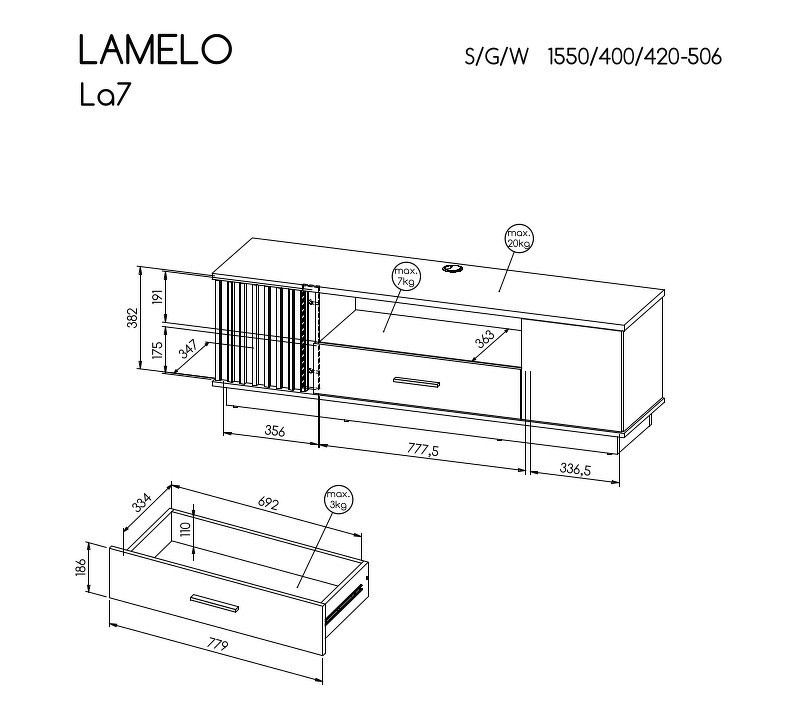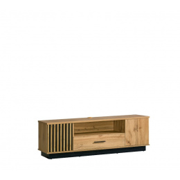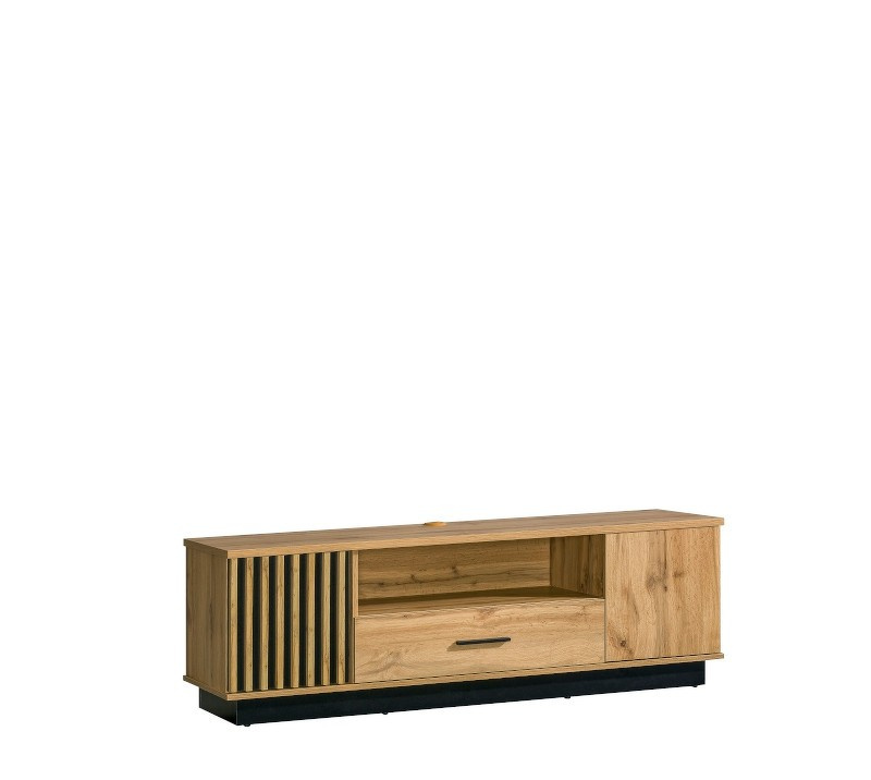 Televizní skříňka se dvěma dvířky, jednou zásuvkou a policí.