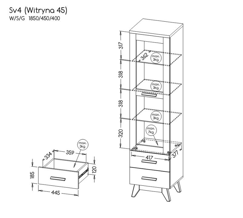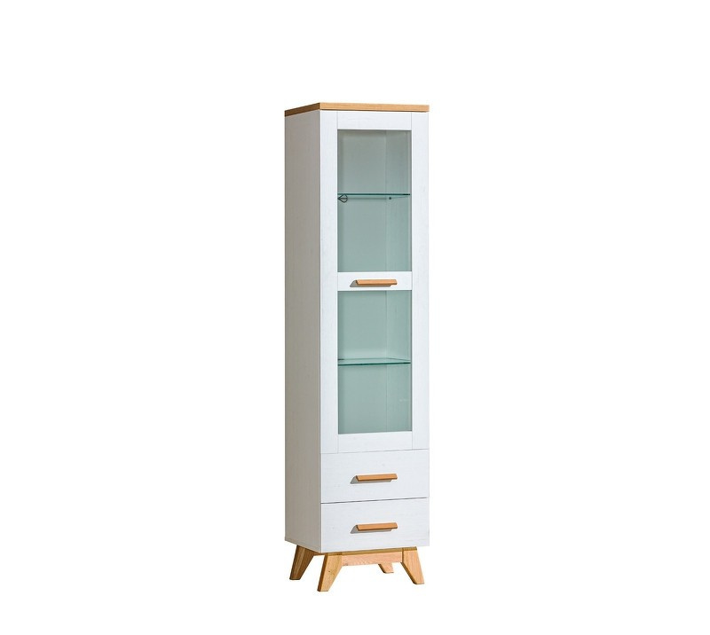 Vitrína s jedněmi prosklenými dveřmi a dvěma zásuvkami.